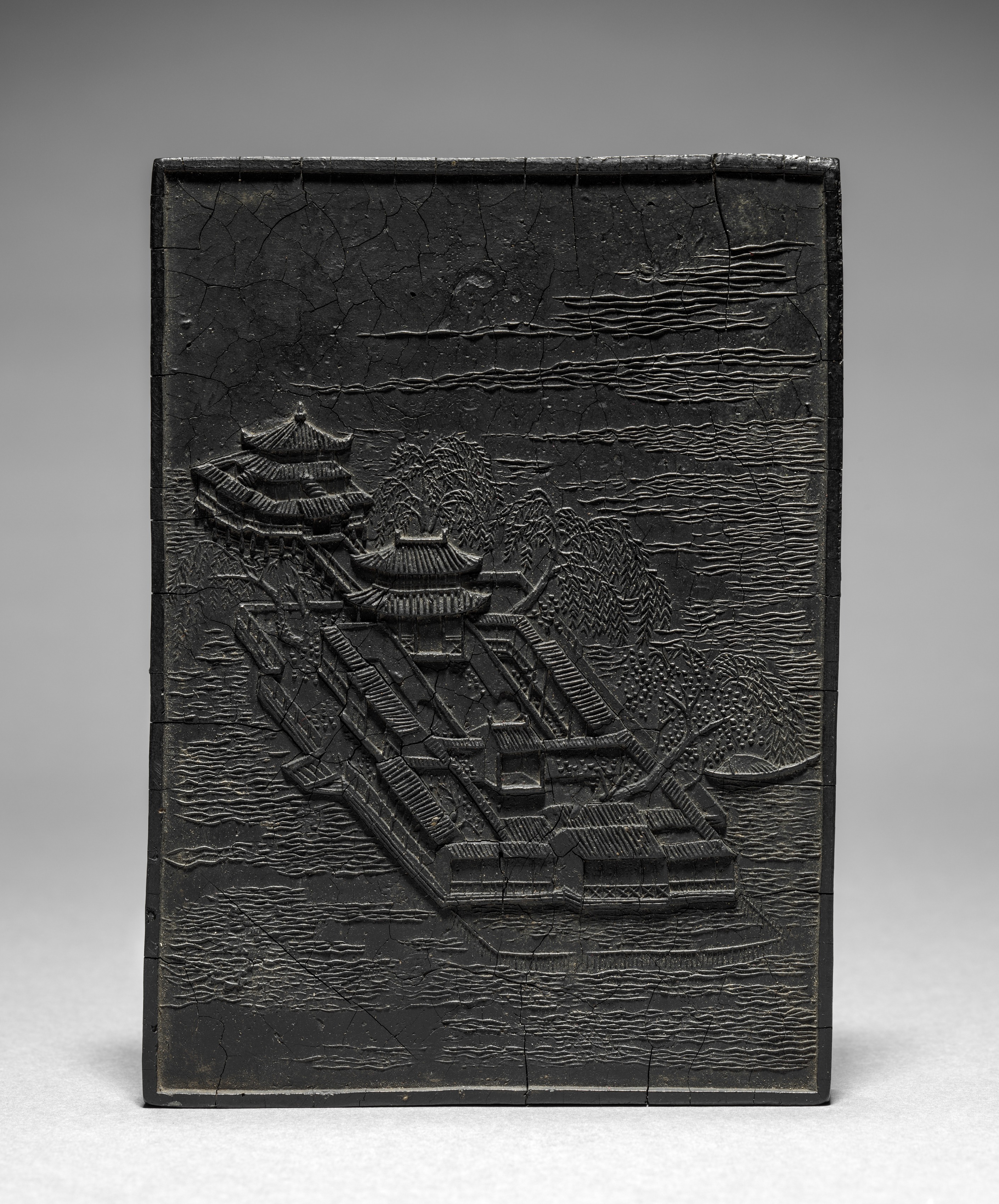 The image depicts a black ink cake by an unknown artist titled "Ink Cake". The ink cake is square and made of a dark material that resembles stone or metal. The surface of the ink cake features a raised design that includes a large building with multiple roofs and a body of water. The building appears to be a traditional Chinese structure, possibly a temple or palace. The body of water is depicted with wavy lines, suggesting movement. The ink cake has a rough texture and appears to be cracked in several places. The background of the image is a gradient of gray, with the ink cake sitting on a white surface. The lighting in the image is dim, with a shadow cast by the ink cake on the surface below it. The overall appearance of the ink cake suggests that it is an old, possibly antique, object.