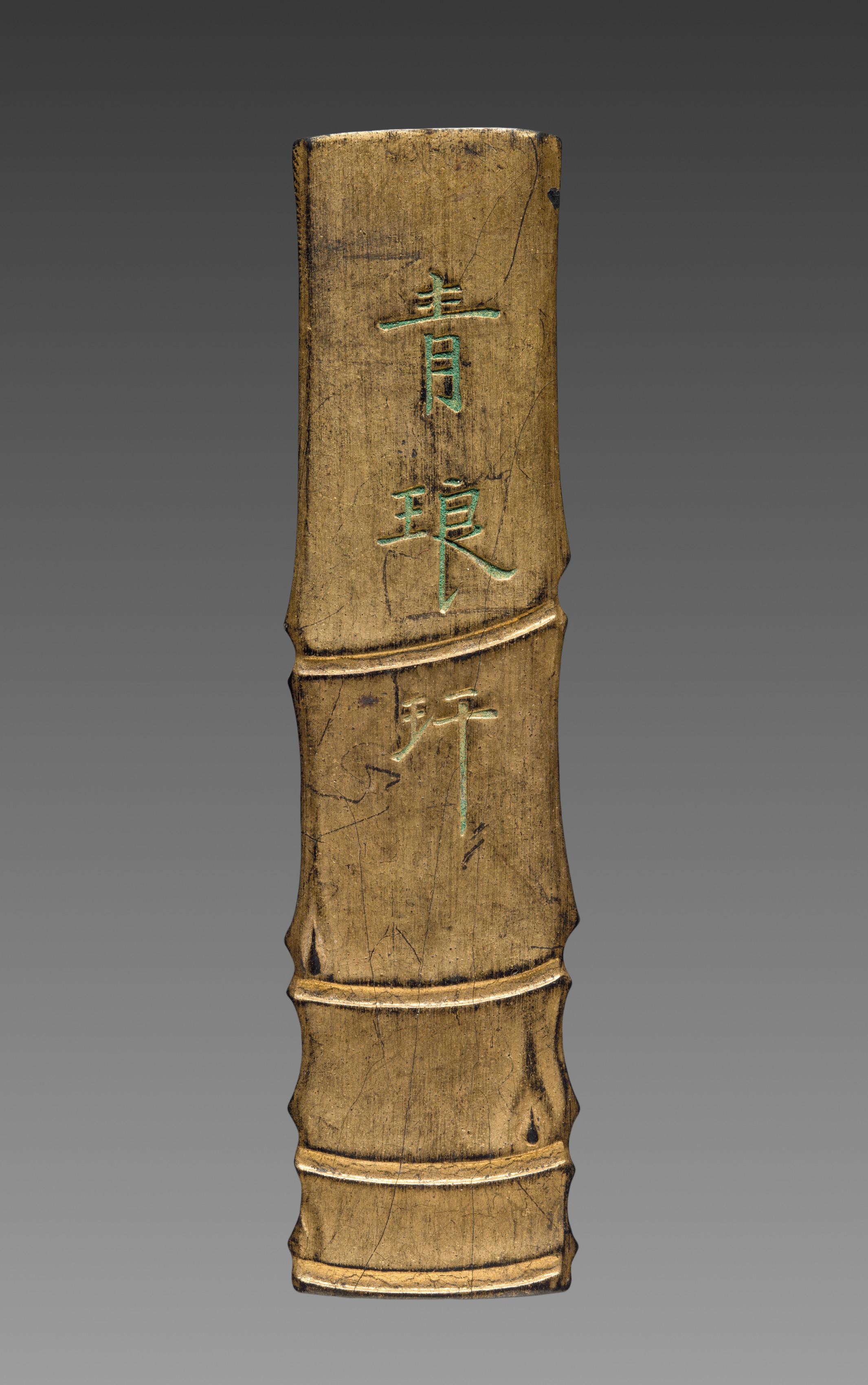 Rectangular object resembling bamboo, made of bronze or brass, with a brown patina. Object is divided into sections by raised bands, mimicking bamboo nodes. Three raised Chinese characters in green patina are centered on the object, one above the other. Object has a rough texture, with visible scratches and marks. Background transitions from dark grey at the top to light grey at the bottom. Title: Ink Cake. Artist unknown.