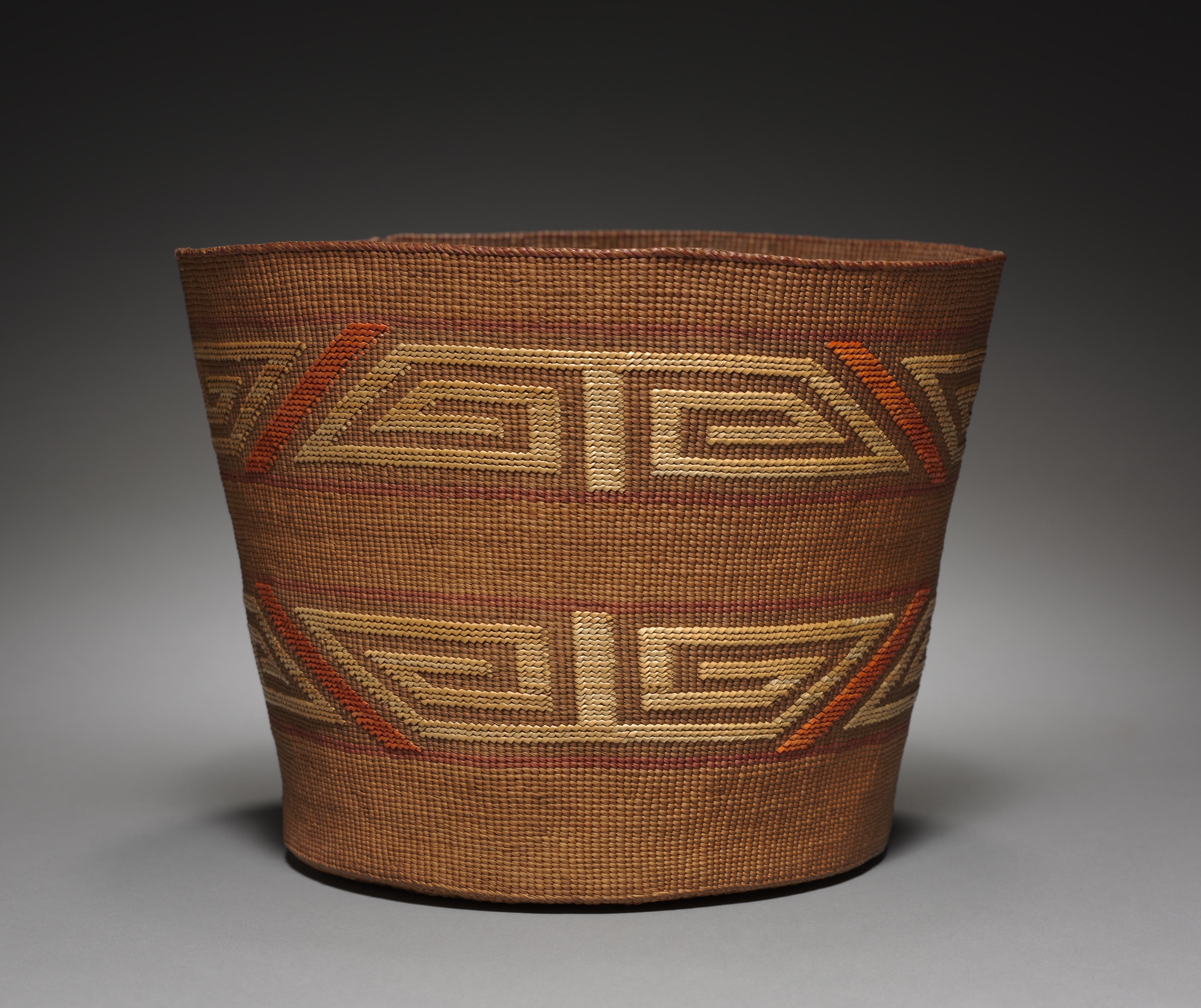Brown woven bowl, by Northwest Coast or Plateau artist, has a wide mouth and tapering body. The exterior features a geometric pattern in shades of brown, beige and orange. The pattern consists of two rows of identical designs. Each design comprises two identical squares with a double-line border and single-line interior lines. The squares are positioned one above the other. Orange triangular shapes with straight edges are on either side. The bowl sits on a gray surface with a dark background.