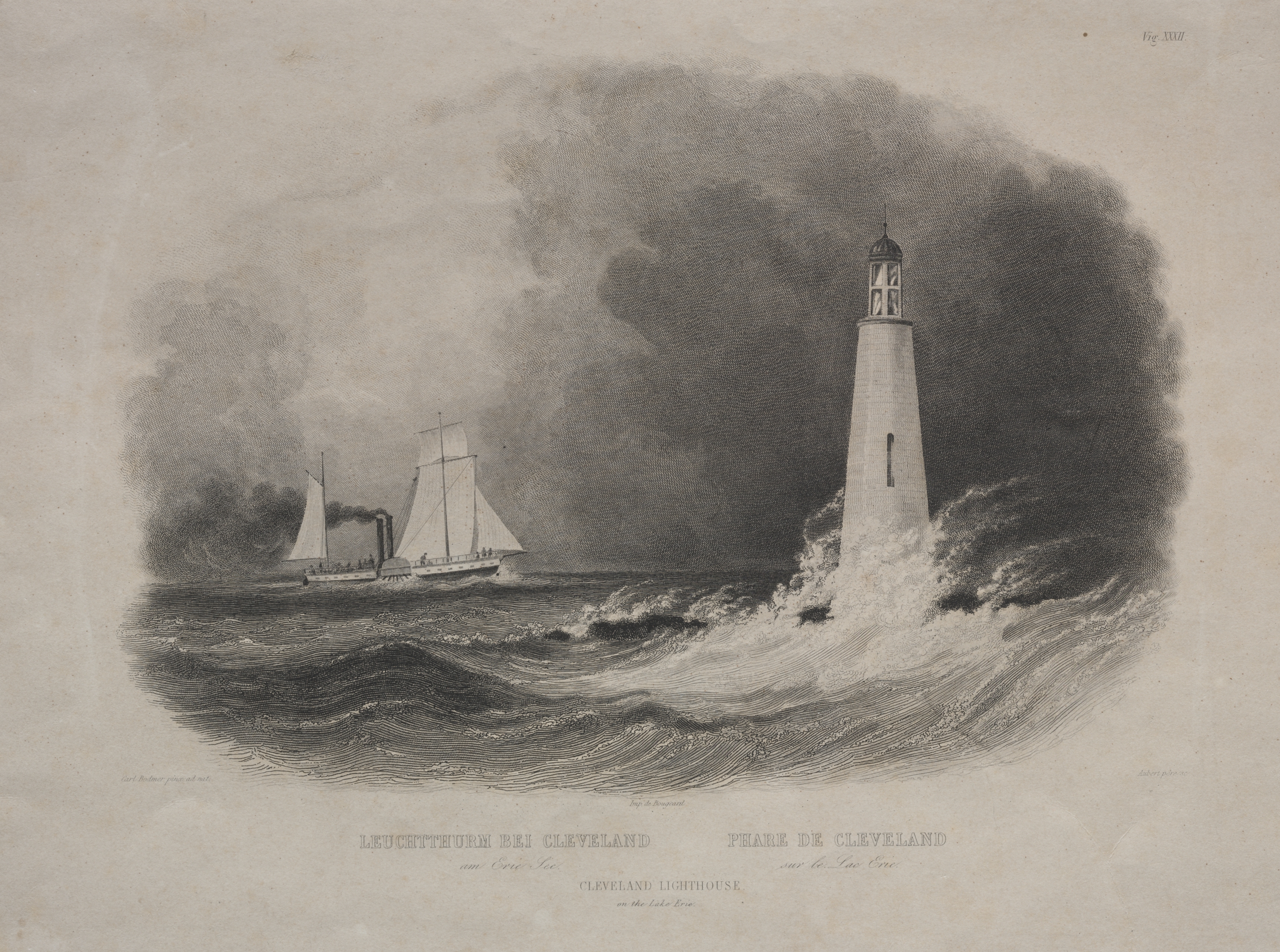 Black and white drawing of a lighthouse on the right and a ship on the left. The lighthouse is tall and white with a black roof that has a cross on top. The ship has two sails up and appears to have a smokestack emitting smoke. The water around the lighthouse appears to be turbulent and there are waves crashing at its base. The background contains dark clouds, suggesting a stormy day. The image has a light-brown border surrounding the drawing. There are captions in three different languages at the bottom of the image.