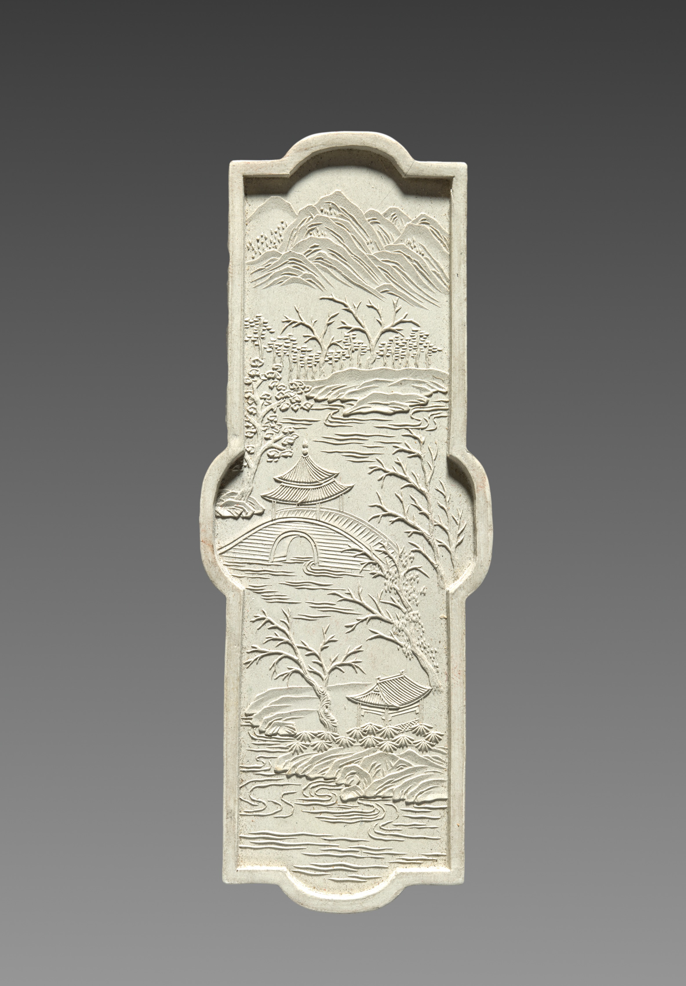 Rectangular ink stick with handles on both sides; landscape scene carved into surface; scene features a pagoda and bridge in the background, and mountains and body of water on top and bottom; a boat on the water; several trees with thin trunks and branches; waves on surface of water; mountains in background; gray gradient background. Title: Ink Stick from an Imperially Commissioned Set of Ink Stick with Images and Poems of Famous West Lake Sites Artist: Unknown