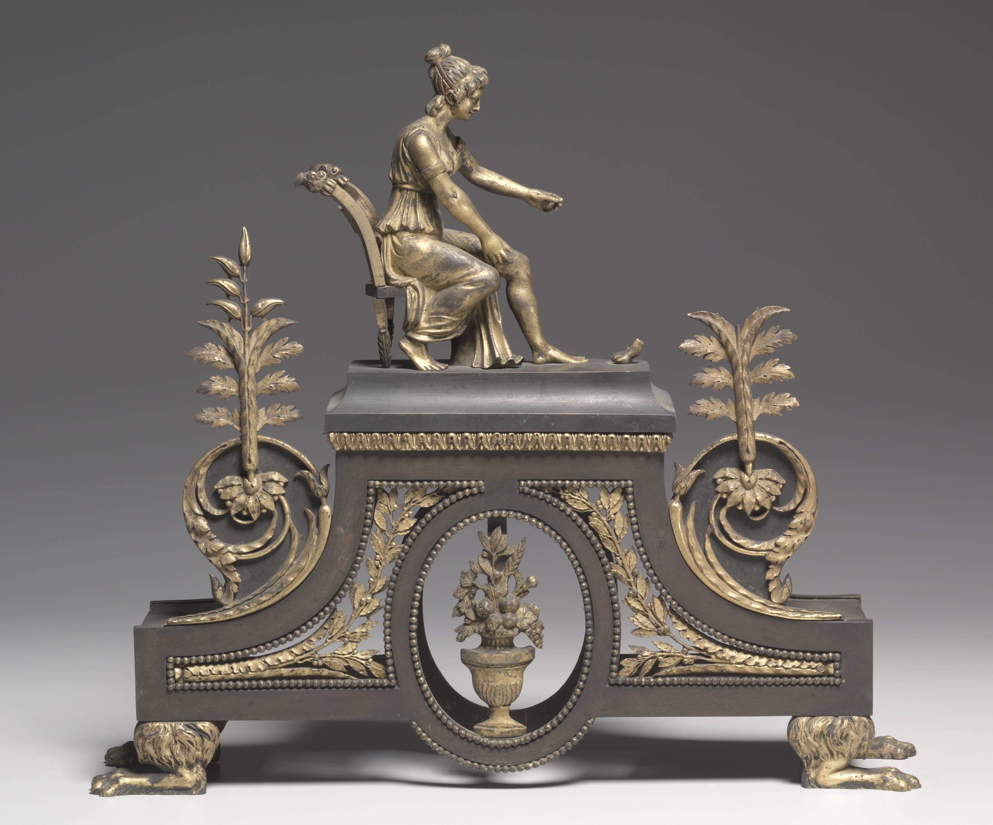 The "Firedog" by French artist Emile-Louis Picault depicts a sculpture with a woman sitting on top. The woman sits on a chair with her back to the left side and her head turned to the right, wearing a short dress. Her left leg is bent with her foot on the pedestal, and her right leg is bent with her foot on the ground. She holds her left hand up with her palm facing down. The sculpture's base features a dark grey color with gold accents. Two small plants are on either side, and a vase with flowers is visible through an oval opening in the middle. The sculpture sits on top of two lion feet. The background of the image is a gradient from dark gray at the top to light gray at the bottom.