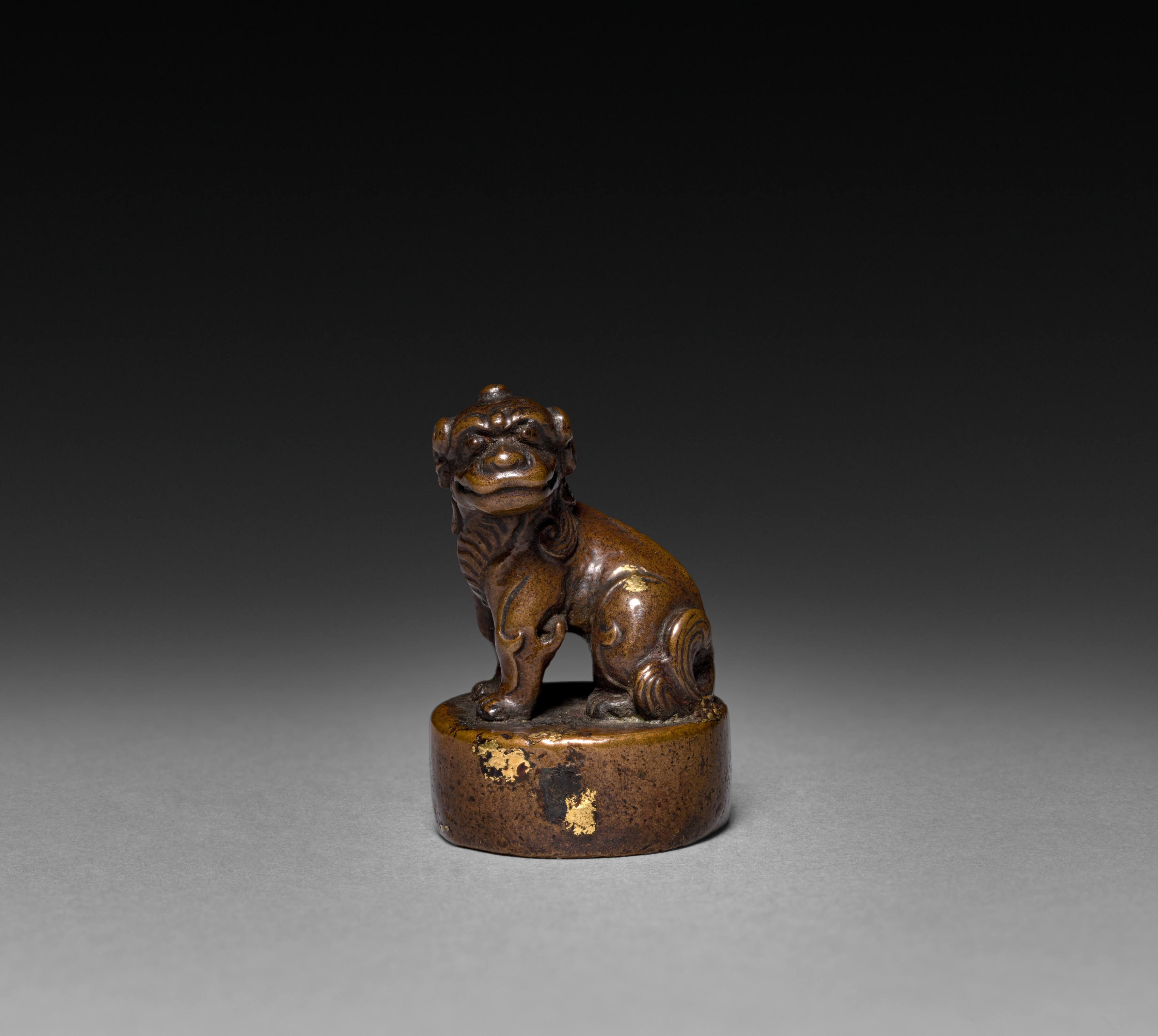 Brown statue of a dog on a circular base, the dog has a curled tail and pointed ears and appears to be a shishi, a mythical creature that resembles a cross between a lion and a dog; statue appears to be made of stone or metal and has some gold paint chipped off the base; background is dark gray to black gradient. Title: Seal, Artist: unknown.