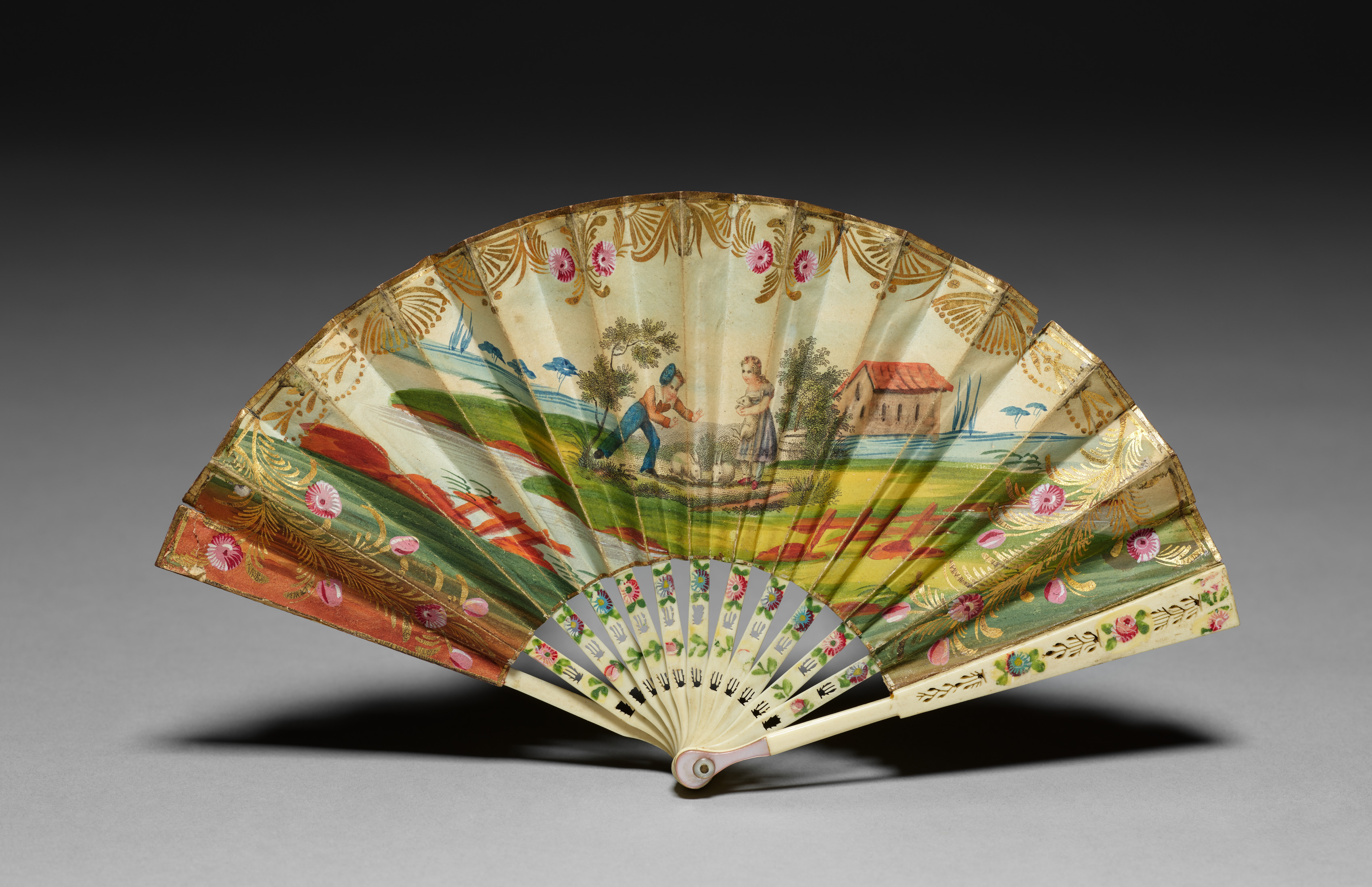 The fan, titled Child's Fan, by an unknown artist, is an open handheld fan with a semicircular shape. The fan has a cream-colored background with a painted scene of two children in a landscape. One child wears a blue hat, blue pants and no shirt. The other child wears a blue dress. They are surrounded by trees, a house with a red roof, and a body of water. The fan has a gold patterned border with pink flowers. The inner section of the fan has a different design with green, red, and pink colors. The handle is cream-colored with an indecipherable design. The fan is displayed against a gray background with a shadow underneath.