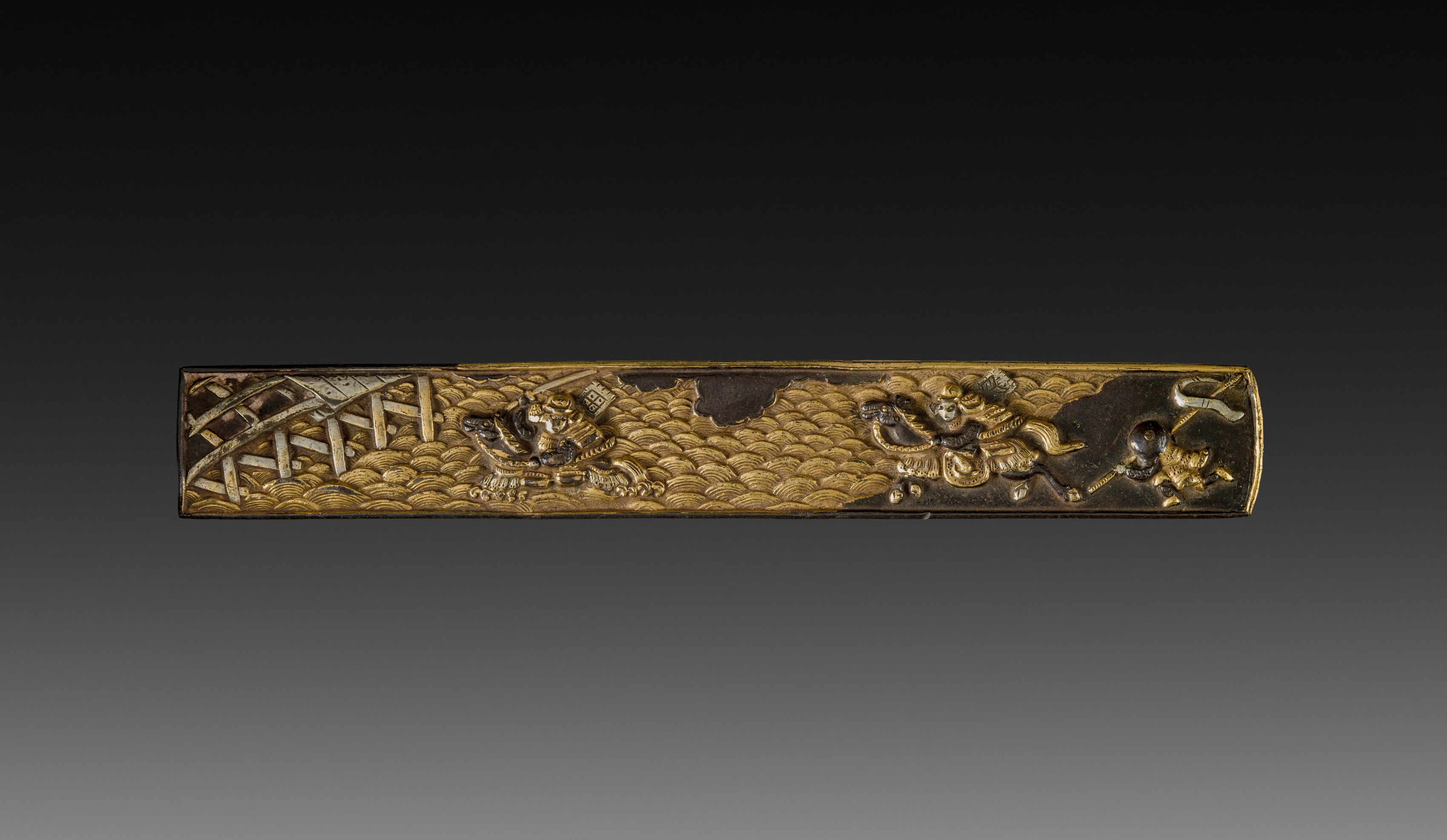 Rectangular object with rounded edges, lengthwise horizontal; primarily gold-colored with a darker background; featuring a dragon design with scales; dragon's head on right side; scales on left side; geometric pattern resembling a fence on far left; gradient background from black to gray. Knife Handle (Kozuka).