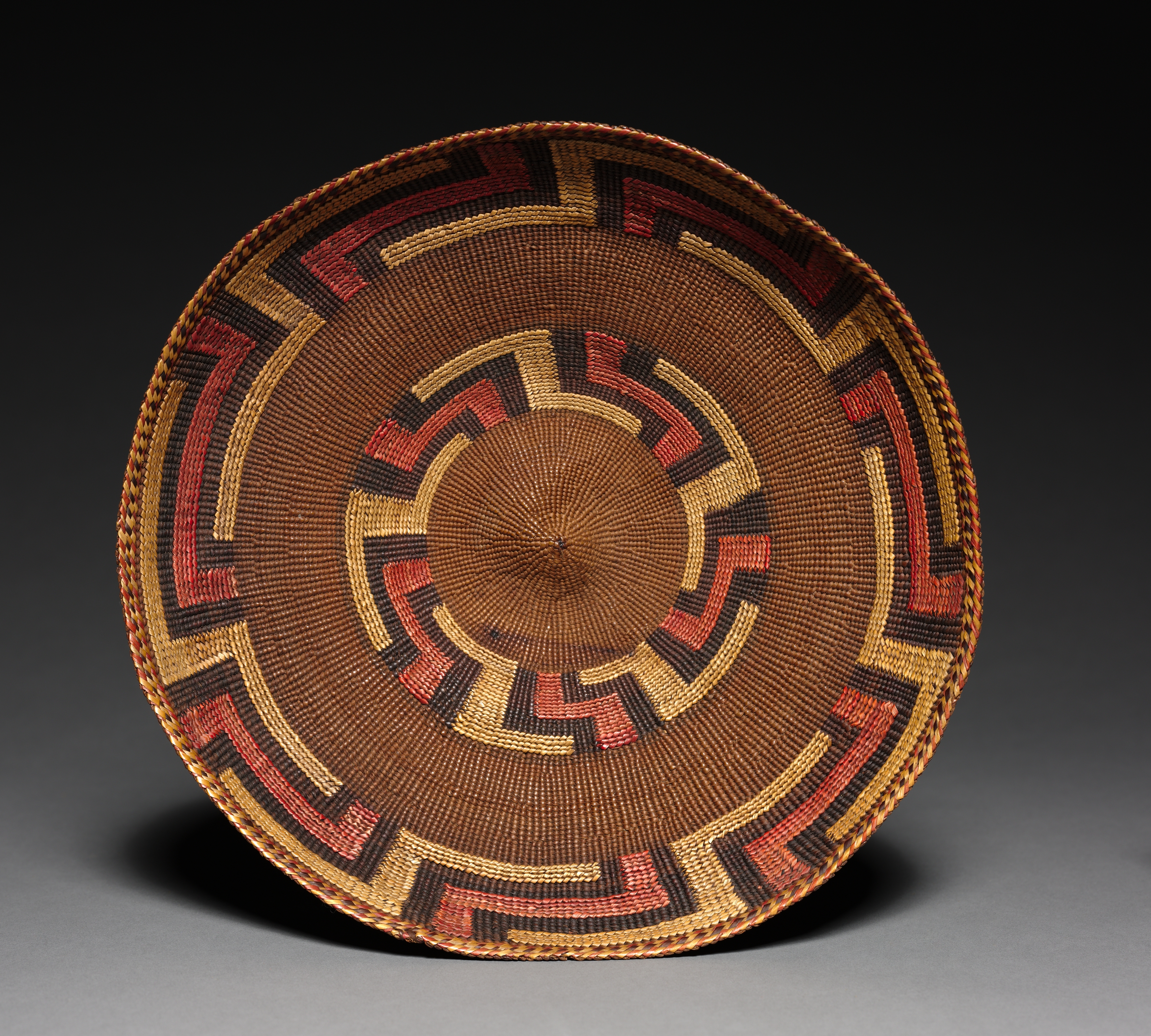 Tray by unidentified artist. A woven tray with a brown base, featuring a geometric pattern in shades of red, yellow, and brown. The tray's circular shape is accentuated by a thin braided border around its edge. The pattern consists of concentric circles, with the center being a solid brown color. The background of the image is dark gray, with a subtle shadow cast by the tray.