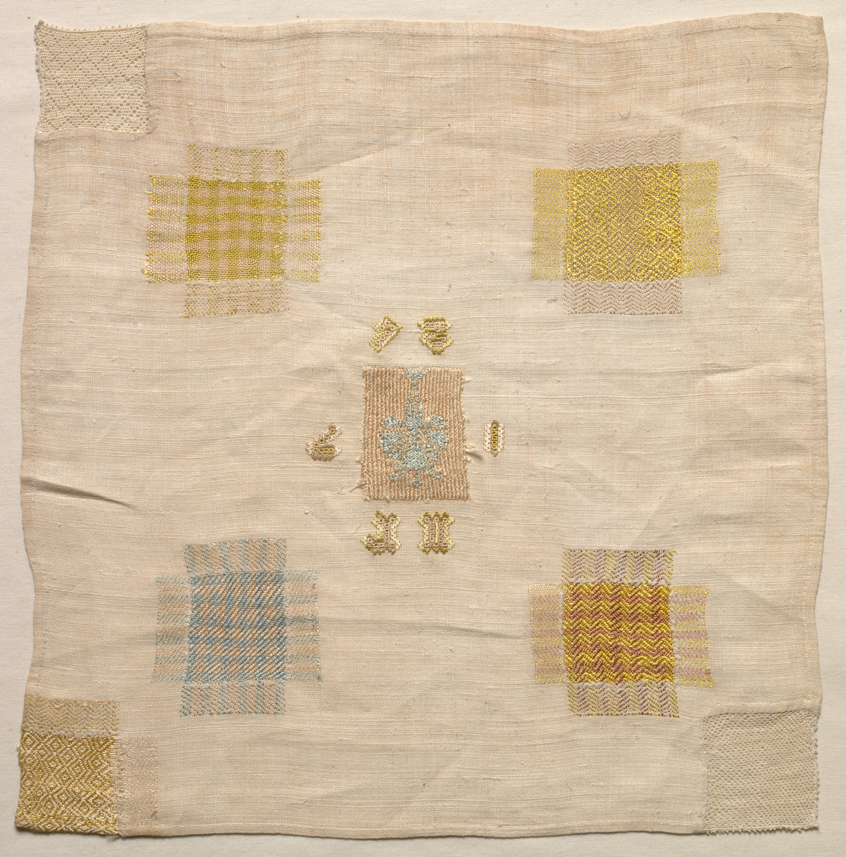Beige fabric with visible weave, slightly wrinkled and wavy edges. Eight patches of various sizes are sewn onto the fabric. The patches are made of different fabrics, with varied weaves and colors. Top left patch is beige with small squares. Top center patch is gold with small squares. Top right patch is gold with a dotted texture. Bottom left patch is yellow with a diamond pattern. Bottom center patch is yellow, orange, and pink with a zig-zag pattern. Bottom right patch is beige with a woven texture. Center patch is beige with blue floral pattern. Four small gold patches are arranged vertically around the center patch. The background behind the fabric is solid beige. "Darning Sampler".