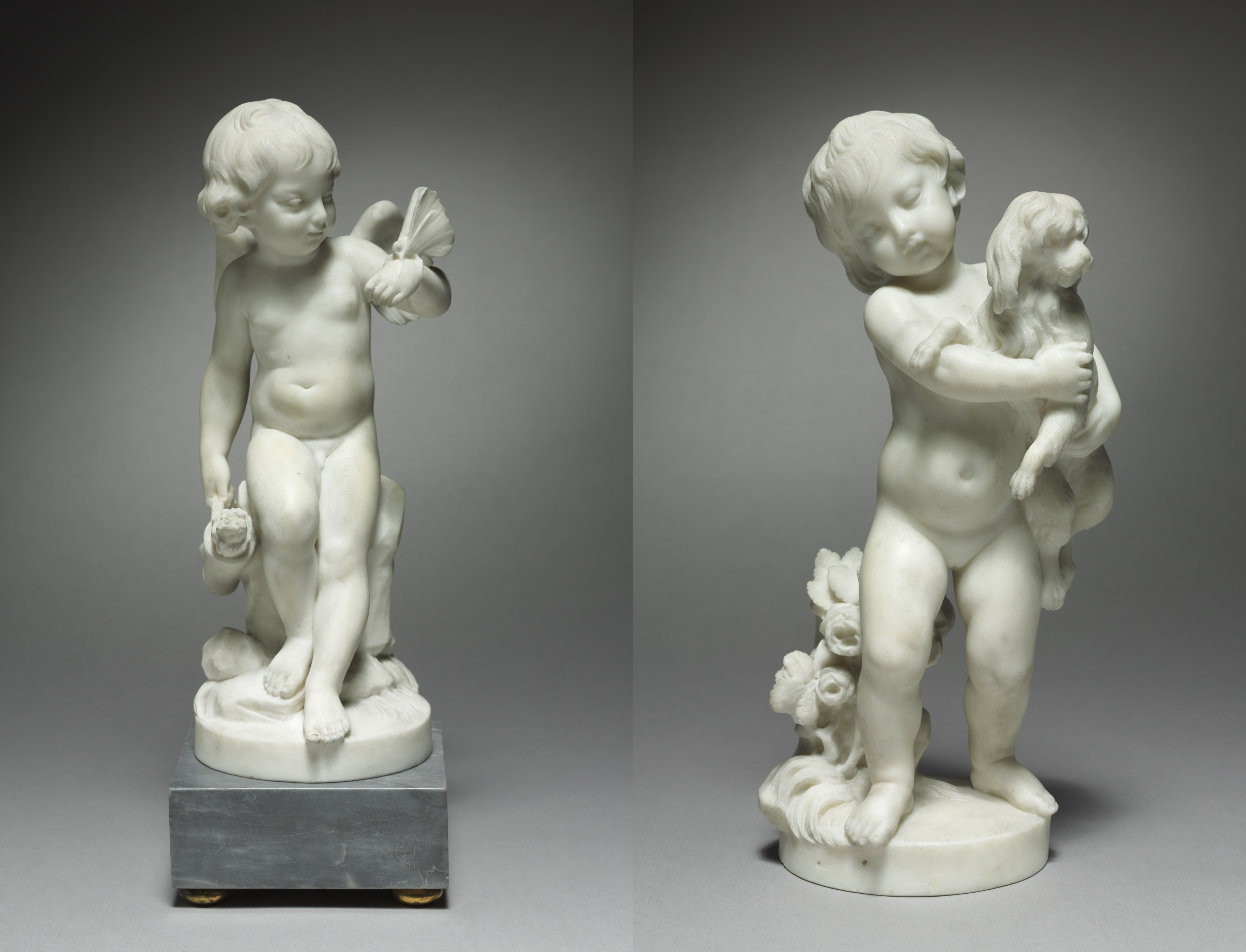 Two white marble statues of cherubs. The statue on the left depicts a cherub with wings, kneeling on one knee, holding a flower or fruit in the right hand, and a butterfly in the left. The statue on the right shows a cherub embracing another cherub, with the embraced cherub holding a bird. Flowers are behind the embracing cherub. Both statues are on round bases. The left statue's base is on a grey marble block with small gold feet. The background is grey and darkens towards the top.