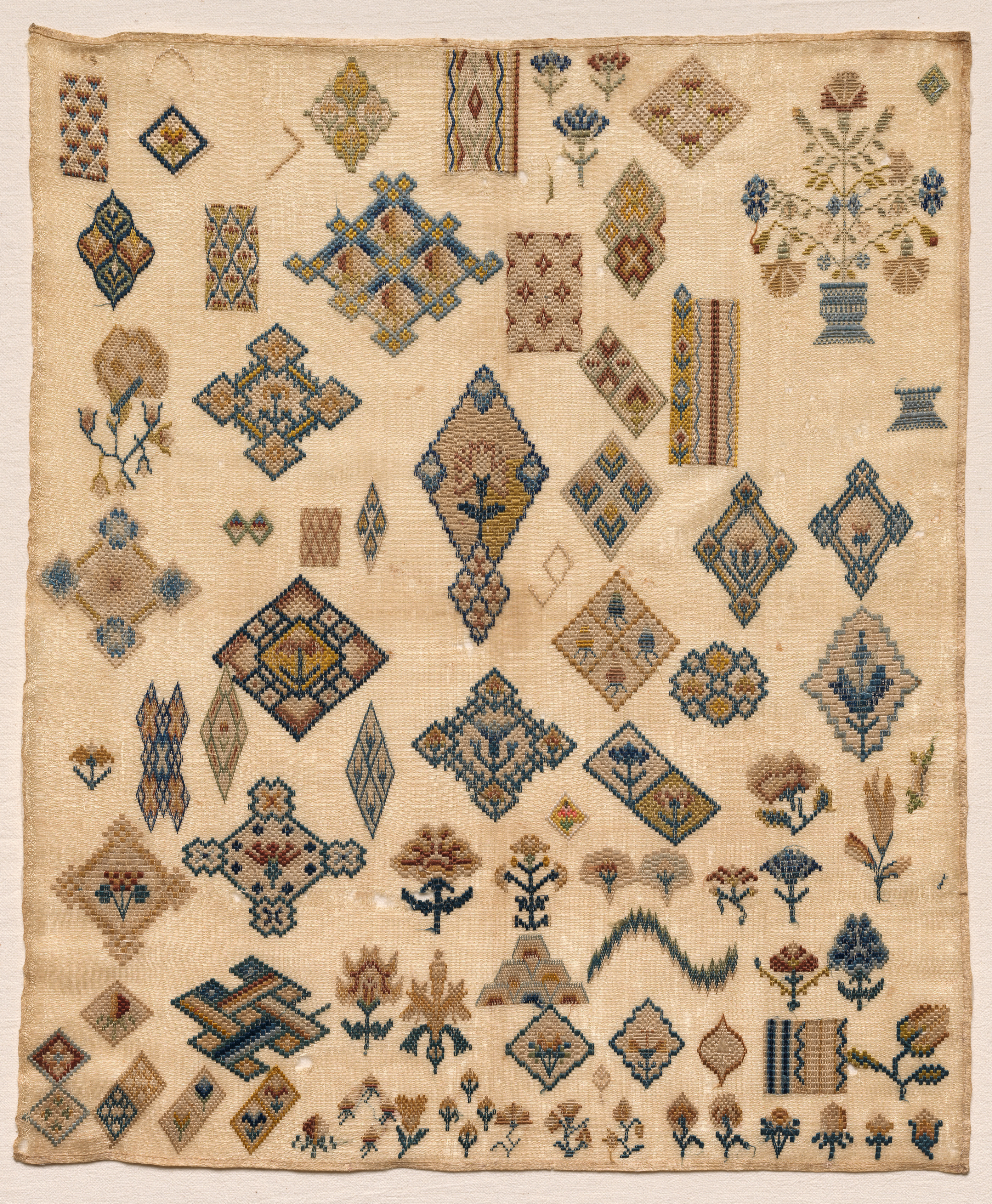 Sampler by unknown artist. A square piece of off-white fabric with a variety of embroidered designs, including diamonds, flowers, and leaves. The designs are arranged randomly across the fabric. They are primarily blue, brown, and yellow. The fabric appears to be old and worn, with some discoloration and fraying around the edges. There are no uniform patterns or repetition. The fabric fills the image and has a rough texture.