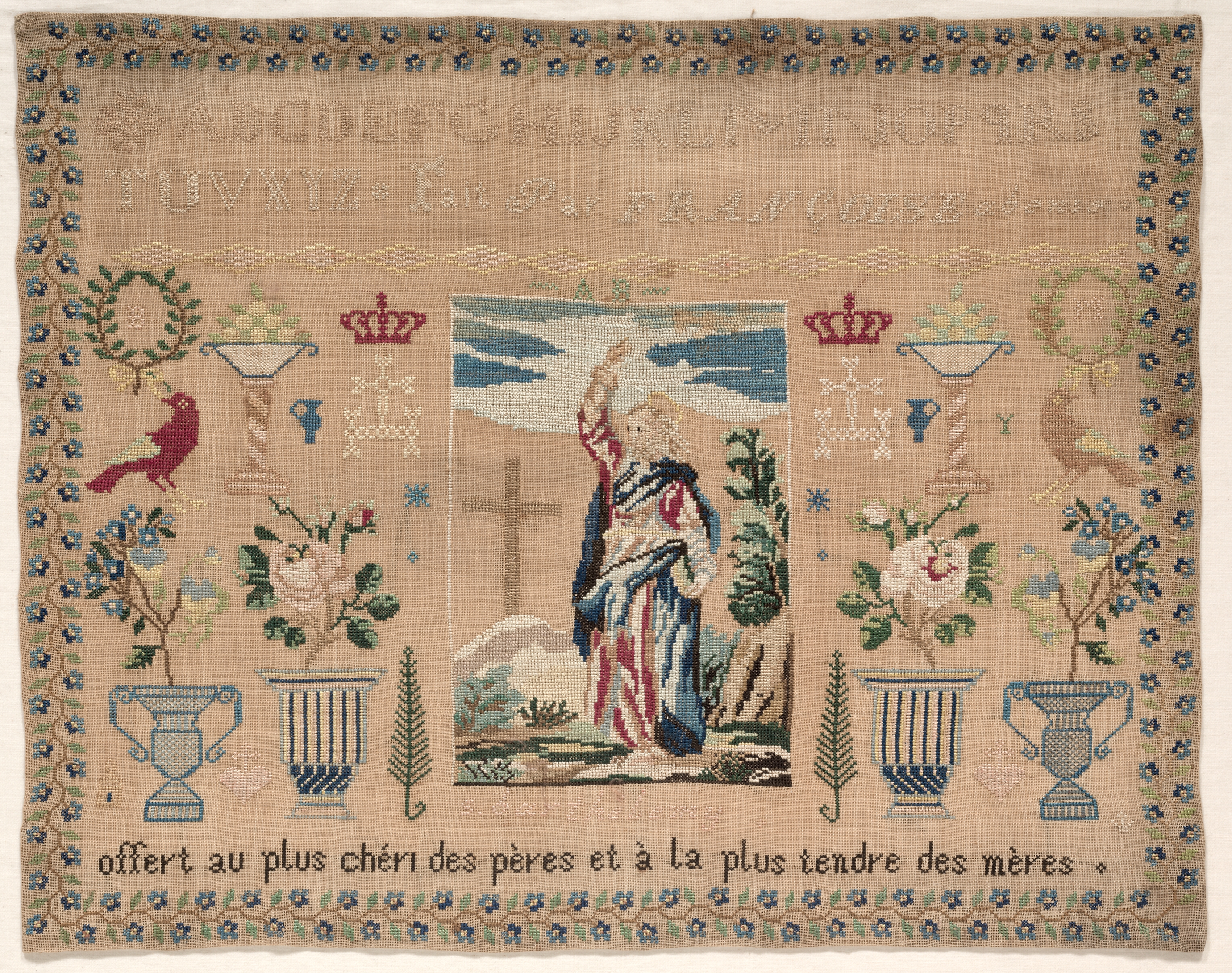 Tan-colored sampler with a central image of a person wearing a blue and white robe with red accents, standing in front of a cross. The person has their right arm raised. The image is surrounded by a border featuring blue flowers with green leaves and stems. Two urns with flowers on either side of the central image, and two urns without flowers. A red bird on the left side of the image. Two crowns, one on each side of the central image. French text at the top and bottom of the sampler. The bottom text reads "offert au plus cher1 des peres et a la plus tendre des meres".