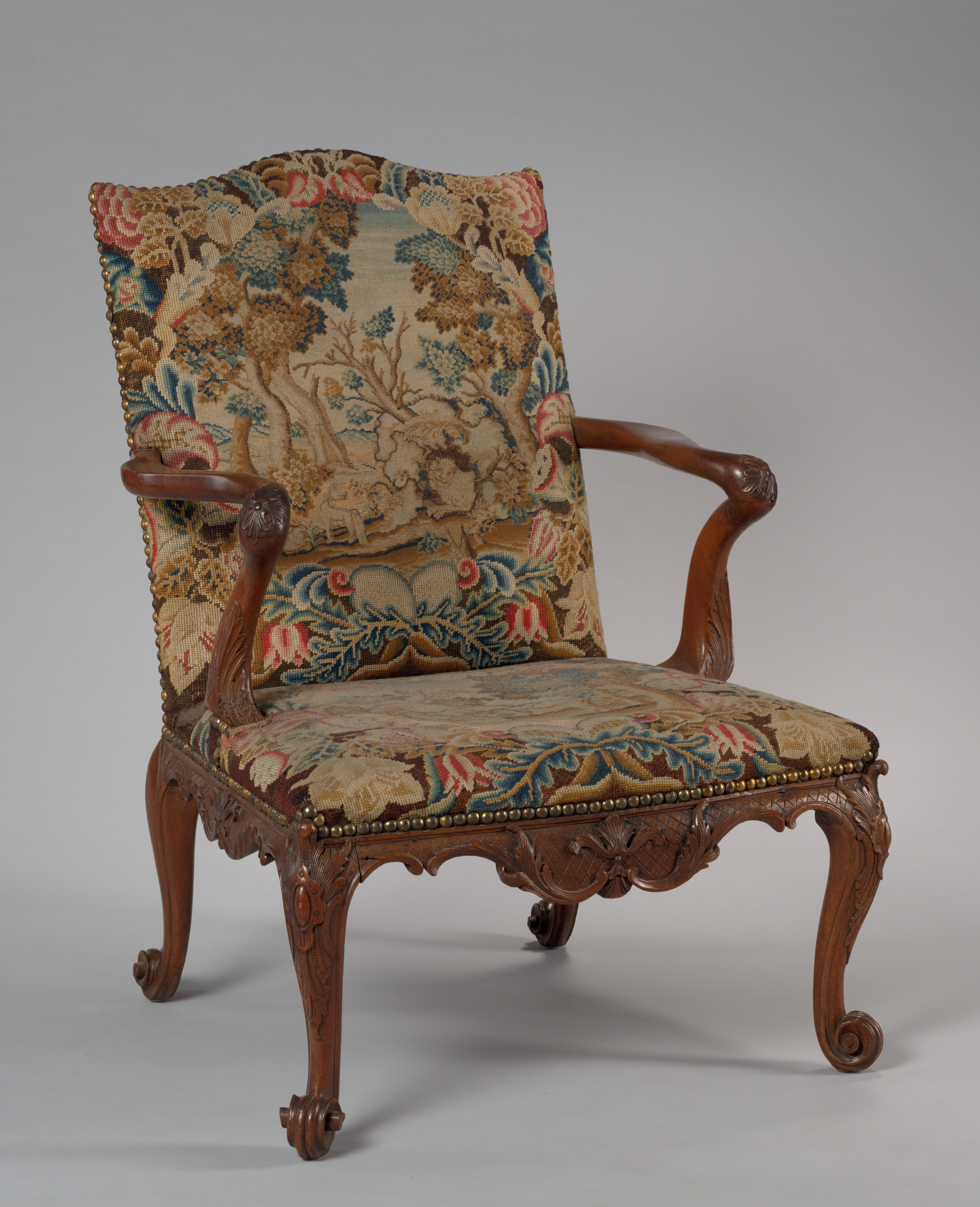 The armchair, by an unknown artist, is a wooden chair with a high back and armrests. The chair's frame is made of dark brown wood and features carved decorations on the legs, arms, and apron. The legs are curved and end in a scroll-like design. The seat and backrest are upholstered in a colorful tapestry fabric featuring a forest scene with trees, flowers, and animals. The fabric is beige with shades of blue, red, and brown. The chair has a low back and curved arms that are slightly raised. The seat is cushioned and has a decorative trim along the edges. The background of the image is a plain gray color.