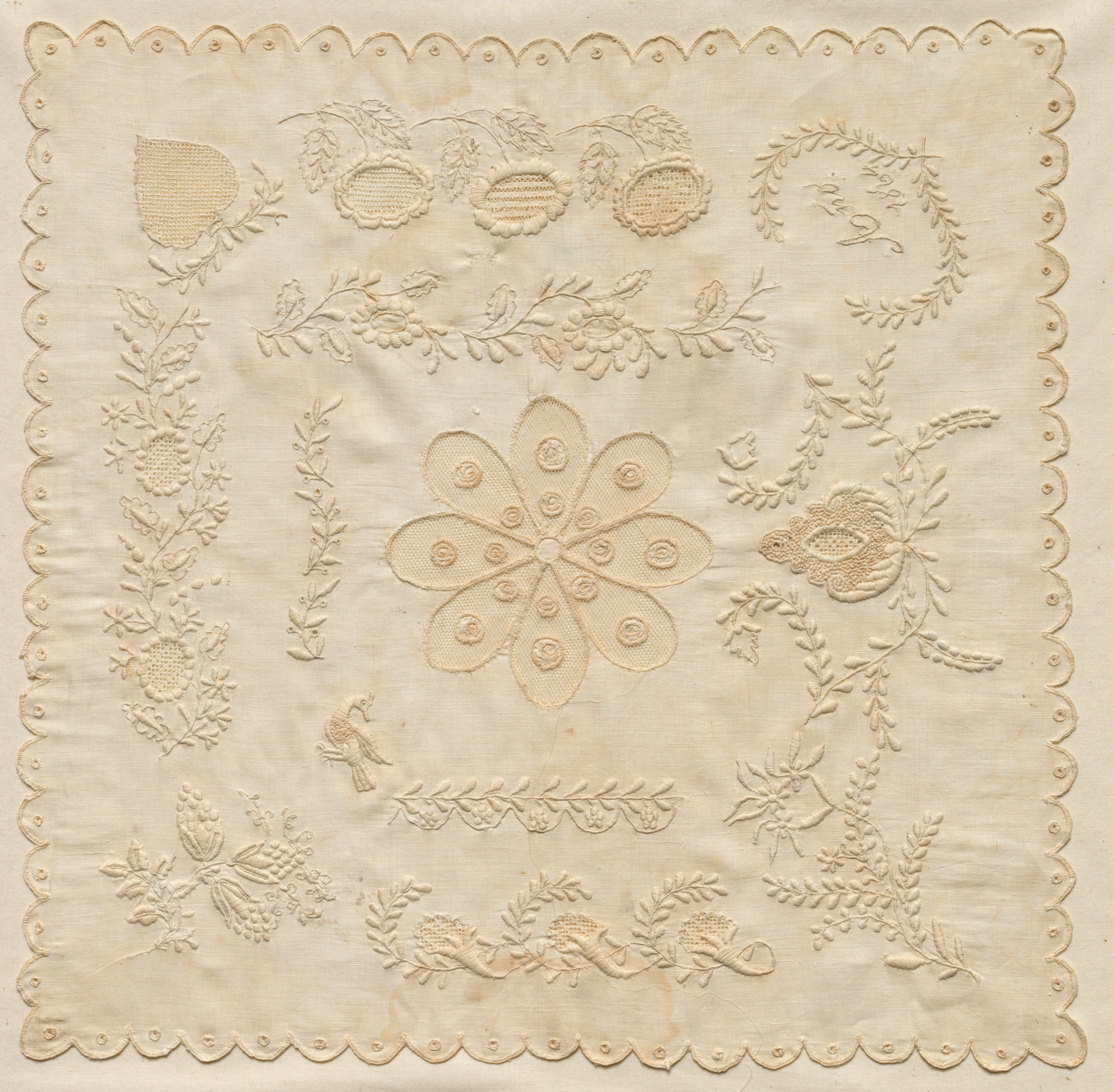 Cream-colored fabric with embroidered designs. Square shape. Scalloped edge with small circles. Embroidered flowers, leaves, and stems in cream color. Large flower with six petals in center. Smaller flowers and leaves arranged around center flower. Wreath-like design to the right. Bird on branch to the left. Various shapes and designs along edges. Fabric appears to be linen or cotton. Title: Sampler, Artist: Unknown.