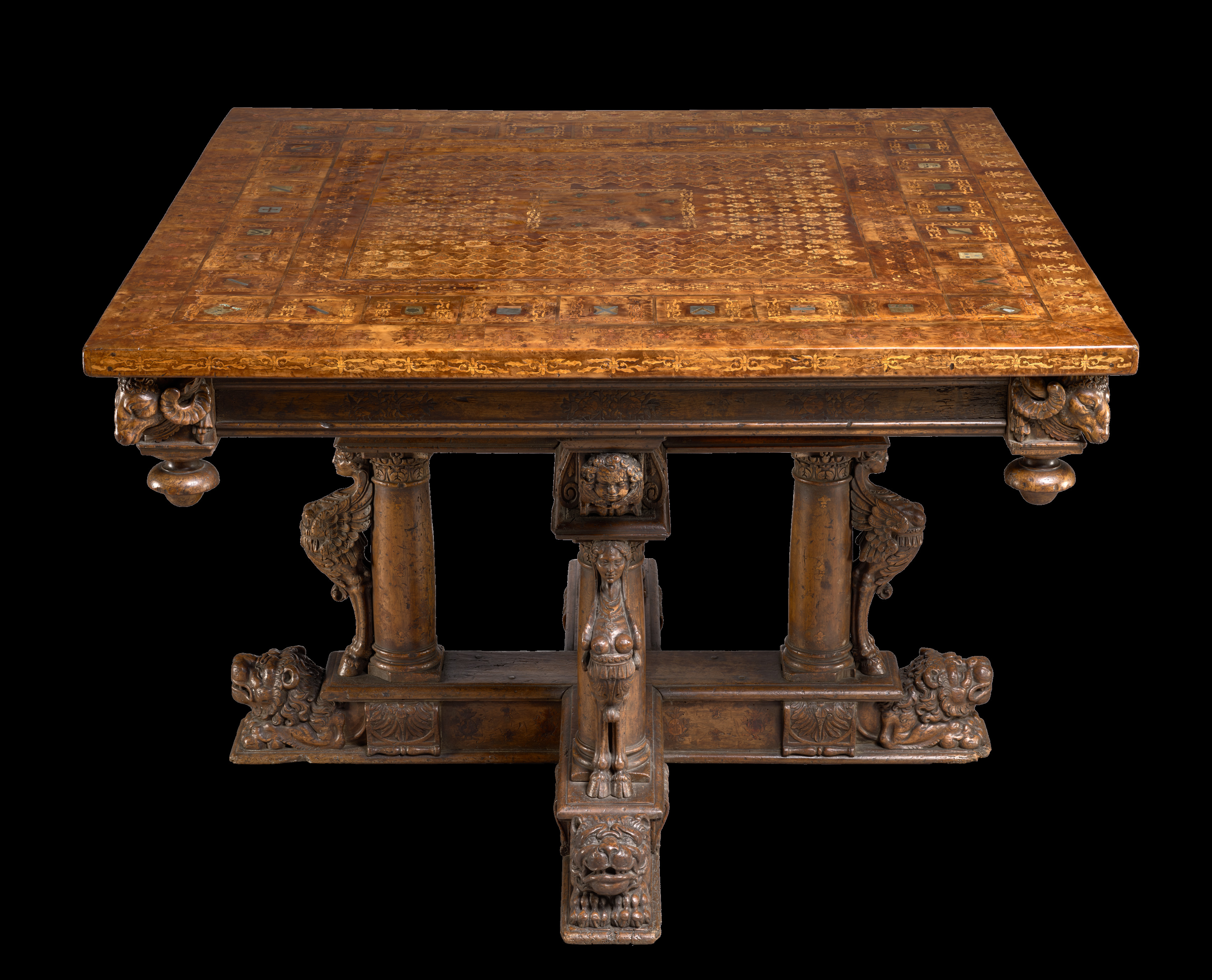 The image shows the 'Inlaid Table' by artist Odilon Redon. The table has a rectangular top with rounded edges. The top is made of wood and features an intricate inlaid design. The inlay consists of various materials, including wood and possibly metal or stone, arranged in a symmetrical pattern. The tabletop is supported by four legs, each adorned with ornate carvings. The legs are connected by a lower stretcher that runs between them, also featuring carvings. The carvings on the legs and stretcher include human figures and animal-like creatures. The entire piece exhibits a rich, dark brown color with signs of aging. The background of the image is solid black.