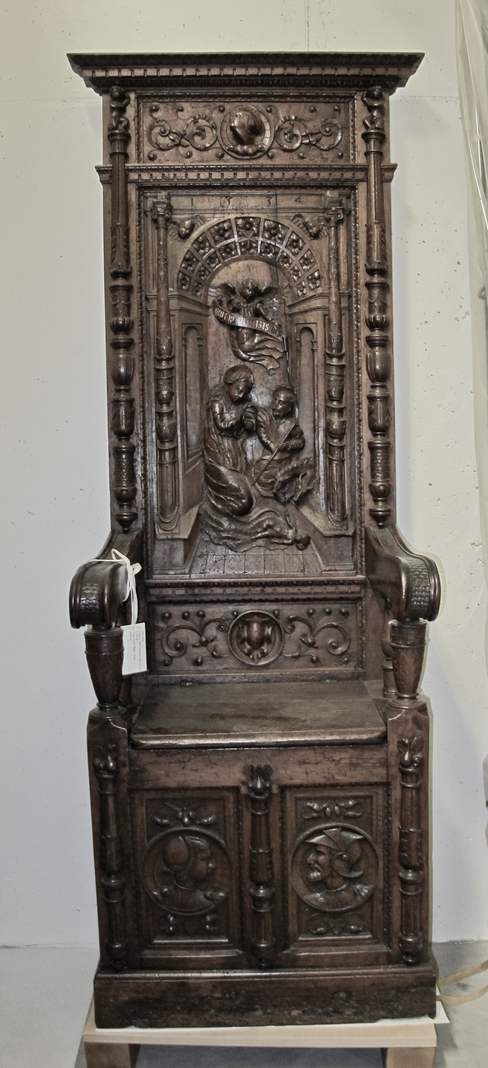 Dark brown wooden chair with high backrest. Chair has armrests. Backrest is tall and rectangular with a flat top. Top of backrest has decorative carvings of scrollwork and a circle. Below that is an arched carving with figure on the left and kneeling figure on the right. Backrest supported by four vertical columns, two on either side. Seat has a flat surface and a small drawer or compartment with a knob. Front of chair has two circular carvings below the seat. Chair sitting on a wooden stand. A white tag on the left armrest. The chair is titled "High-back Stall" by an unknown artist.