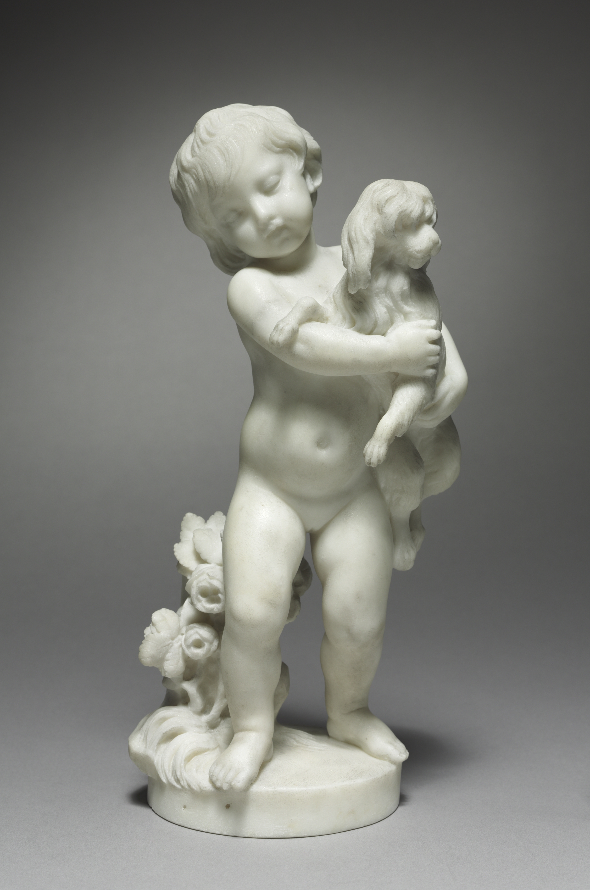 White marble sculpture. Young boy holding a dog. Boy is standing with left leg forward and right leg back. Left arm around dog. Dog under right arm. Boy has short hair. Dog has long hair. Circular base with flowers on left side. Background transitions from dark to light gray. Title: Faithful Love. Artist: Augustin Pajou.