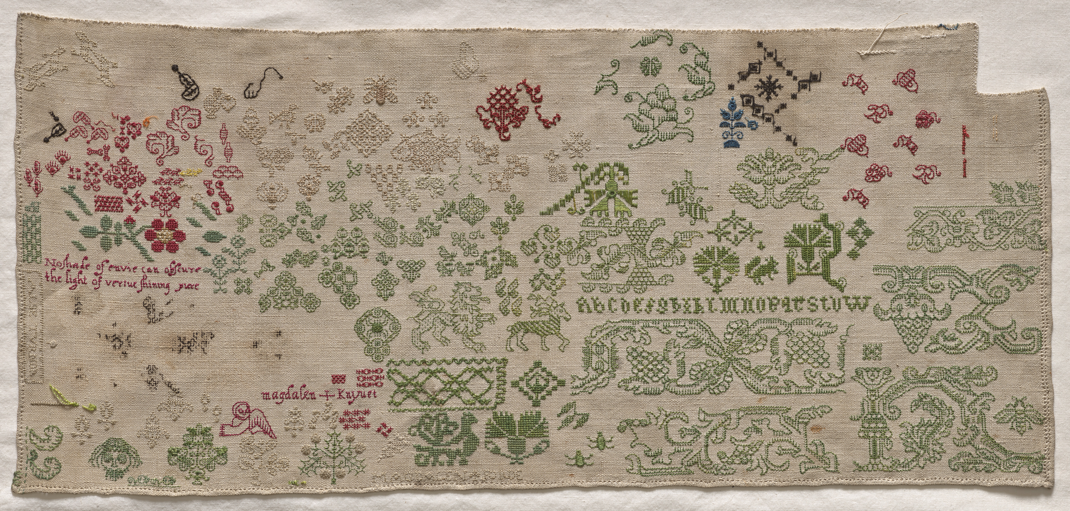 Tan fabric with frayed edges. Embroidered designs in green, red, blue, orange, and black thread. Designs include flowers, leaves, birds, animals, insects, people, abstract patterns, and alphabets. Text in red thread reads "No blemish of vice can offend the light of vertue faining pure" and "Marget Kayeri".