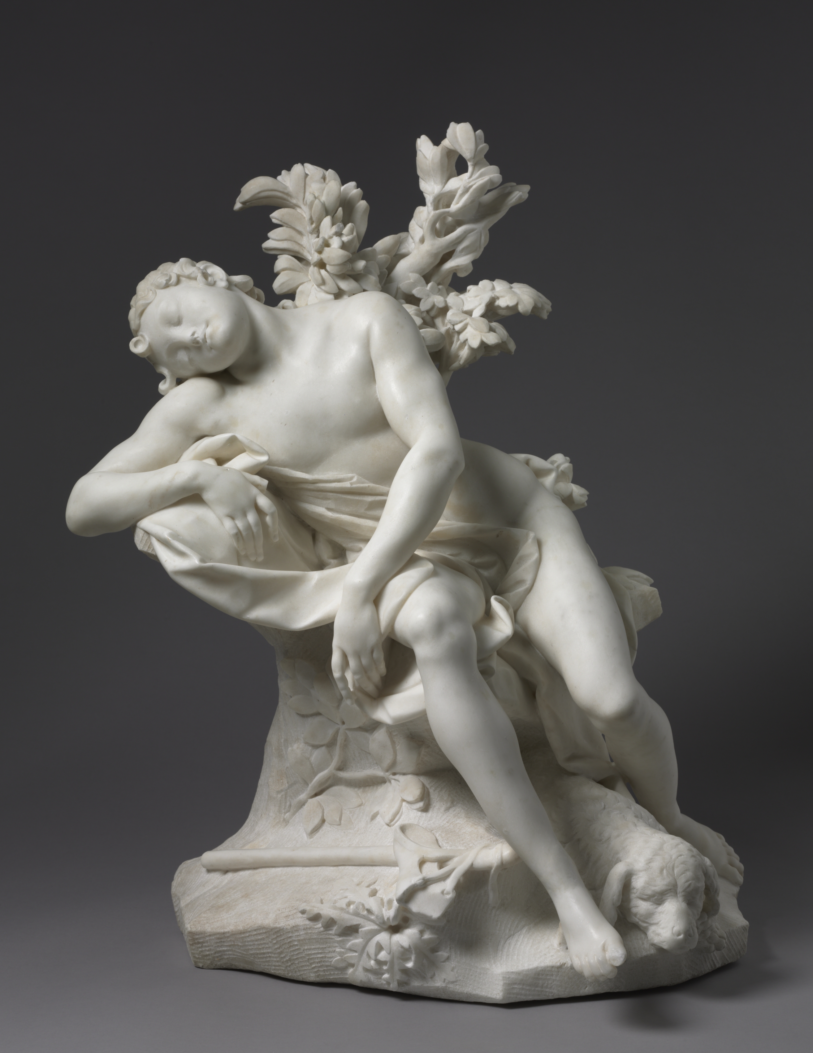 White marble sculpture of a young man reclining on a rock or tree stump, with his head resting on his left arm. He is shirtless and wearing a cloth wrapped around his waist. His left leg is bent at the knee and his right leg is extended. A small dog is positioned at the base of the sculpture, near his feet. The sculpture features leaves and flowers behind the young man. The background is dark gray. The sculpture depicts Sleeping Endymion by Agostino Cornacchini.