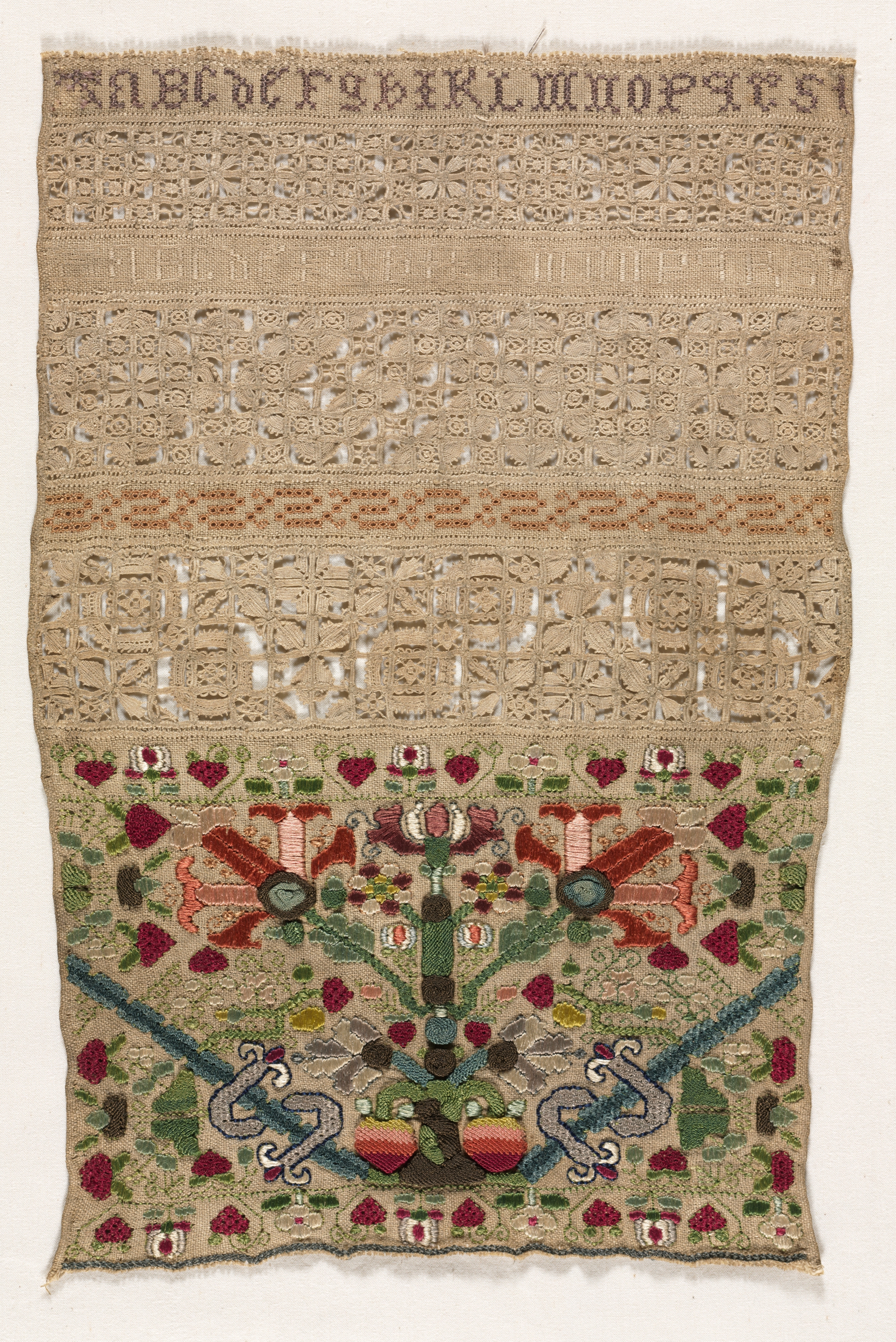 Tan-colored sampler with alphabet stitched across top in purple thread; lower section features a symmetrical floral design with blue intertwined snakes, surrounded by flowers, leaves and berries; upper sections consist of various types of tan and orange lace. Sampler by an unknown artist.