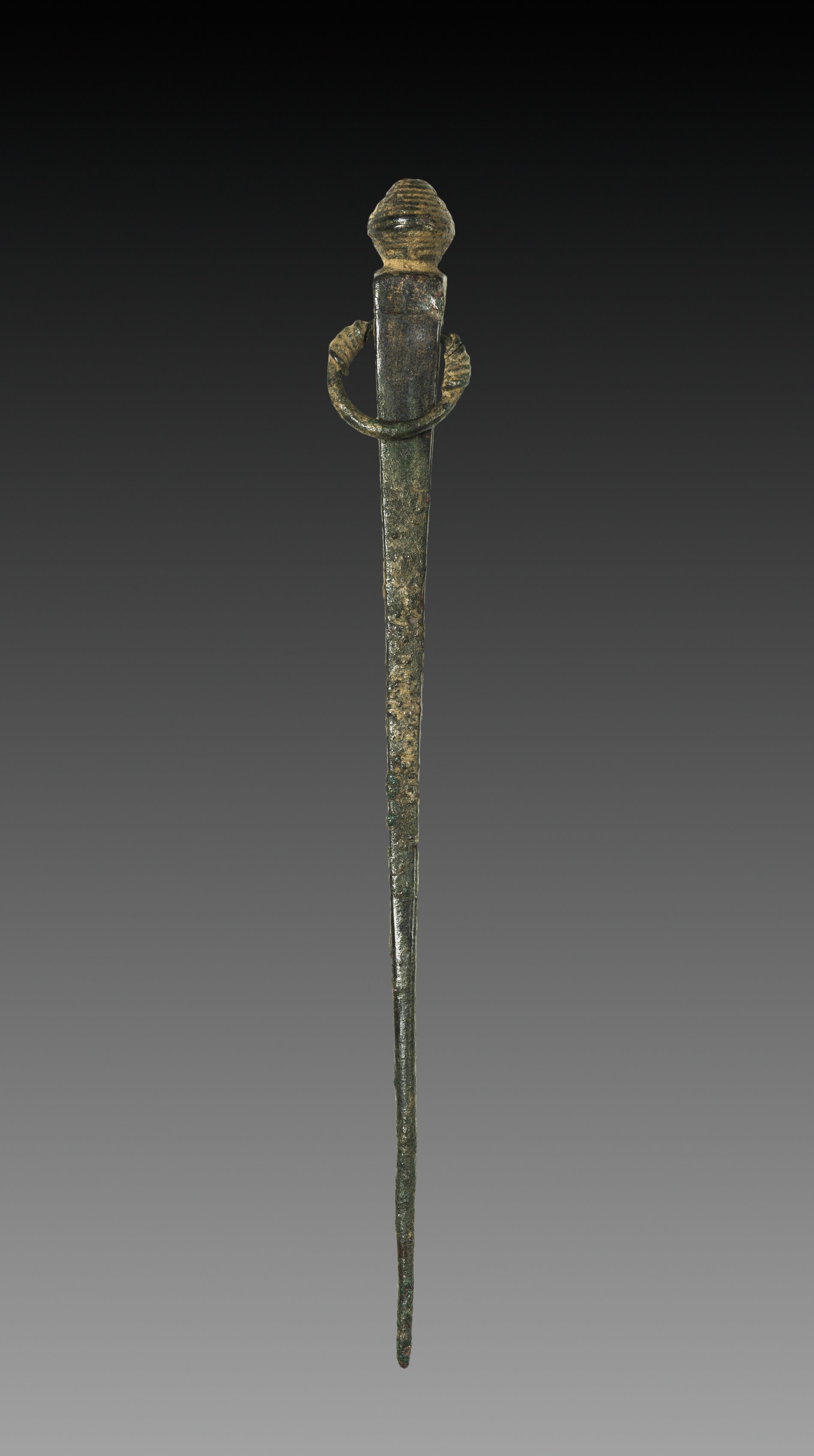 The image shows a long, thin, metallic object with a tapered point, resembling a dagger or pin. The object has a rounded knob at the top with horizontal lines around it, and a smaller, cylindrical section below. Two curved protrusions extend from the sides, forming a loop that attaches to the main body. The object's surface is covered in a greenish-brown patina with yellow patches. The background is a gradient that transitions from black at the top to gray at the bottom. The object is titled "Cotter Pin for Chariot" by an unknown artist.