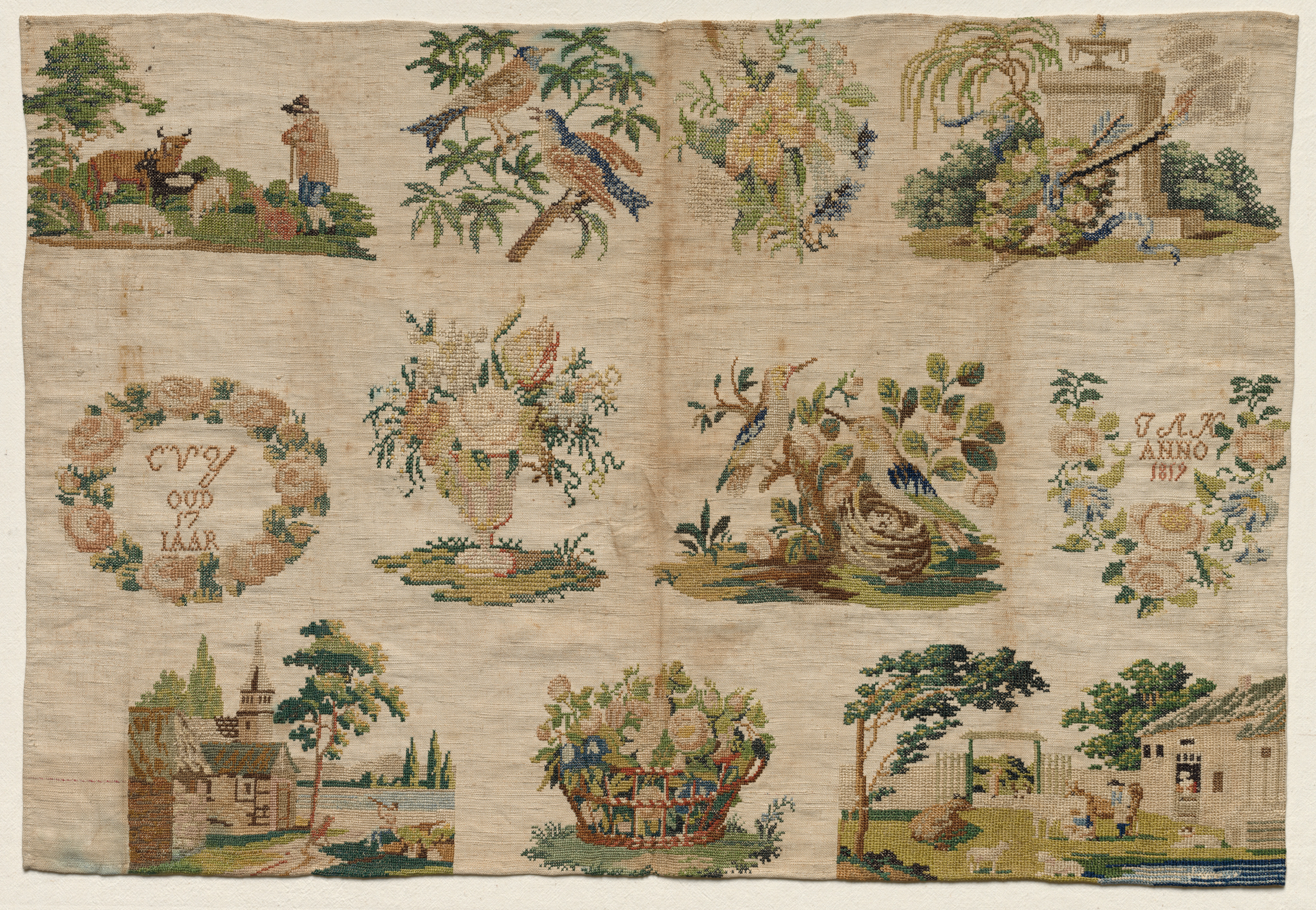 Sampler Fragment by an unknown artist. The image shows a rectangular piece of fabric with a beige background and various colorful designs. The fabric features 10 different scenes arranged in three rows. The top row shows, from left to right: a man and a cow; a bird on a branch; a building with a pagoda roof and trees. The middle row shows, from left to right: a wreath with text; a potted plant; a bird's nest; a floral wreath with text and the date "1612". The bottom row shows, from left to right: a building with a tower; a plant in a basket; people standing outside a house. The designs are stitched with colored thread and feature various plants, trees, buildings, animals, and people. The fabric appears old and worn. The designs are detailed and include a variety of colors. The text in the wreaths appears to be in Dutch. The date "1612" is visible on the fabric. The scenes are separated by stitching. The fabric background is a light beige color. The stitching is intricate and detailed. The overall appearance is of an antique piece of embroidery.