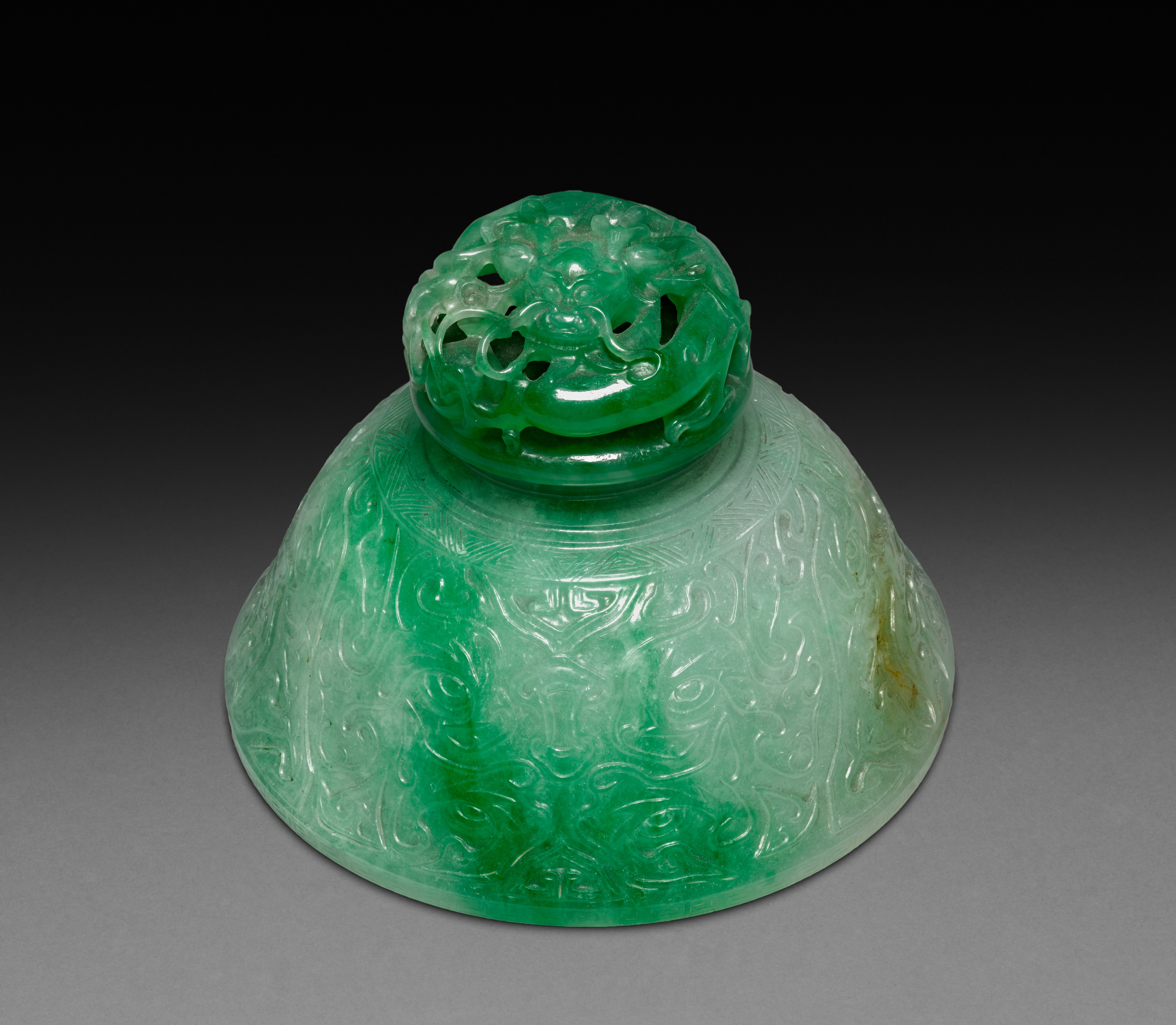 The Incense Burner (lid) by an unknown artist is a green jade object. The object has a wide, rounded base that tapers to a narrower top. The base features intricate carvings of swirling patterns and shapes. A small, circular lid sits on top of the base. The lid is also made of green jade and has a carved design on its surface, featuring a central motif surrounded by curved shapes. The background of the image is dark at the top and gradually lightens towards the bottom.