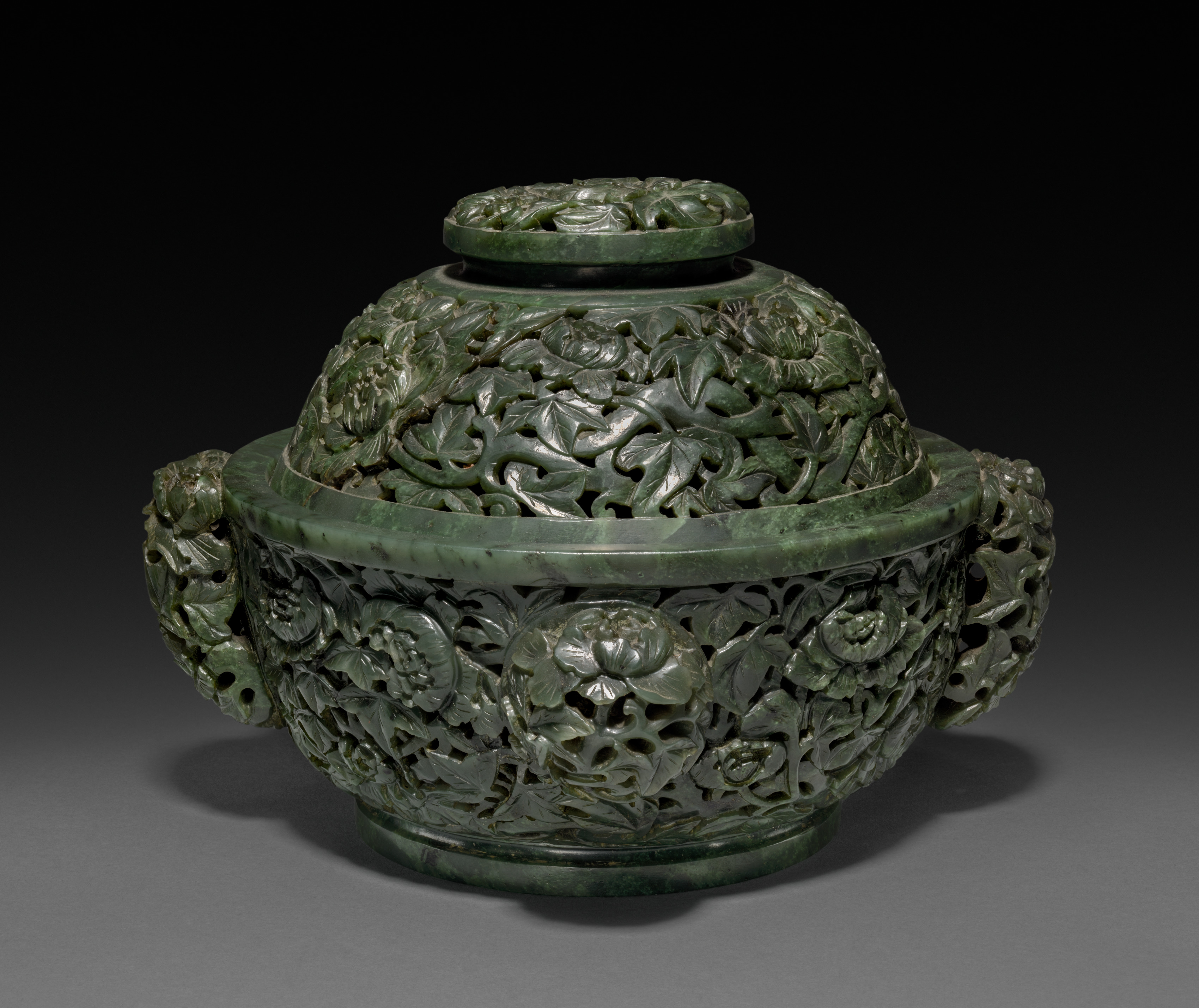 The Fragrance Container by artist is a dark green, jade-like container with a lid. The container has a rounded body, a short neck and a small circular lid. Two handles protrude from the sides. The entire surface is intricately carved with a design featuring flowers, leaves. The background is black to dark grey, with the container casting a shadow on the surface below.