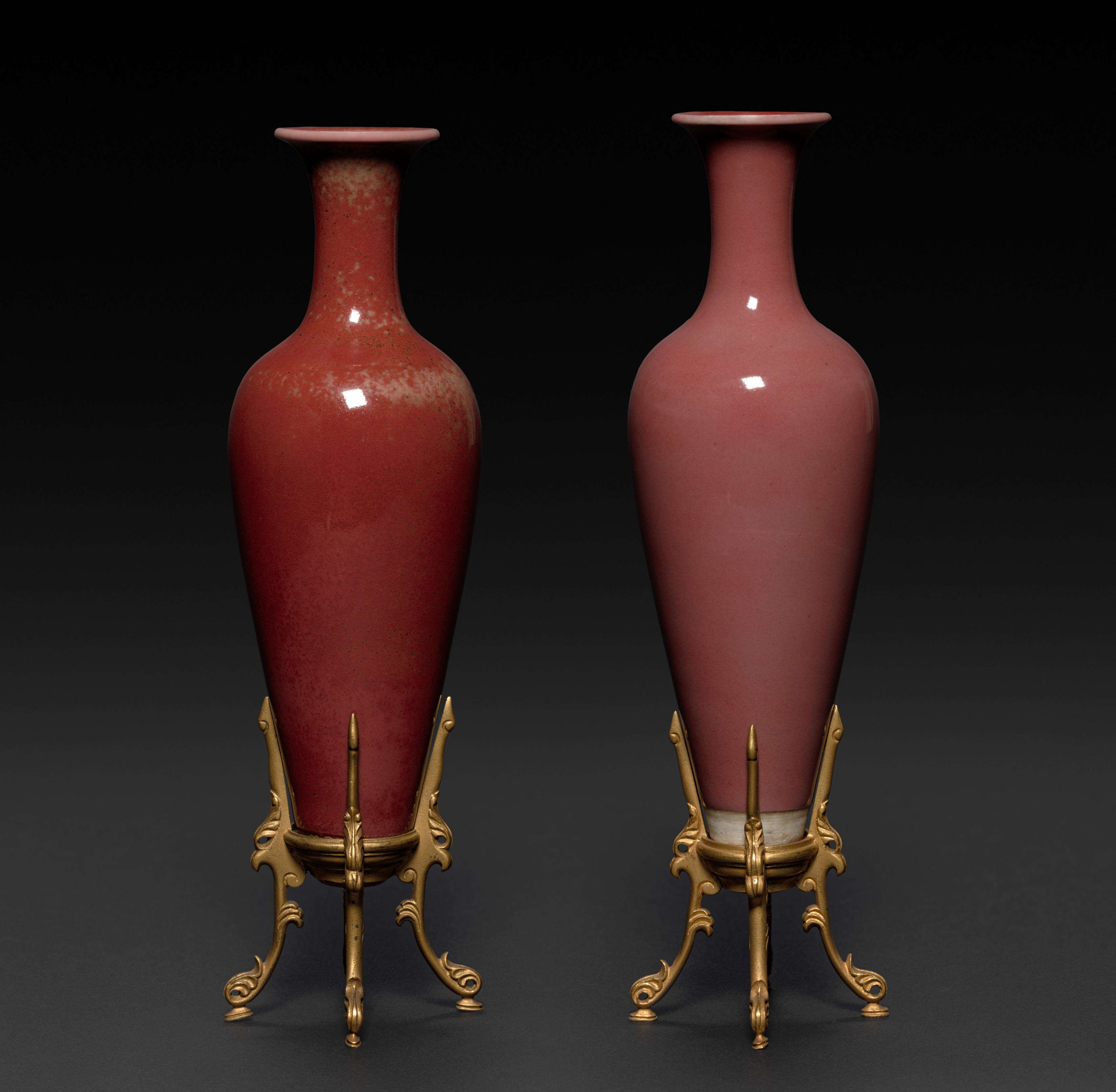 Pair of Peach Bloom Glaze Bottles by artist. Two reddish-pink vases with a glossy finish, one with a more orange tint and white speckles and the other a solid pink color, both have a wide mouth and narrow neck, tapering down to a wider body. The vases have a small foot and are placed on ornate gold stands with three curved legs and decorative elements. The background is dark grey to black.