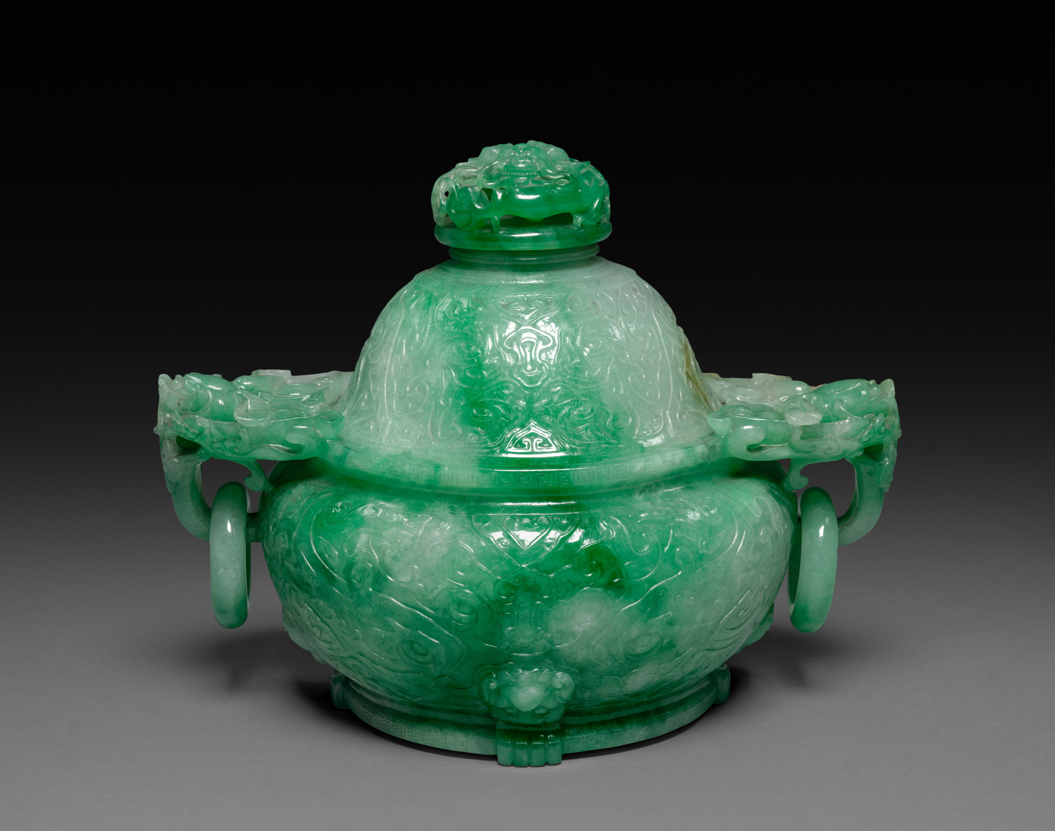 The Incense Burner by artist is a green jade vessel with a domed lid and a rounded body. The object has two handles on either side, each featuring a dragon design. The handles are shaped like rings and are attached to the body of the vessel. The lid is adorned with a small knob on top. The body and lid are intricately carved with floral patterns and other designs. The base of the vessel is flat and circular. The object has a glossy finish, indicating it is made of polished jade. The background of the image is dark gray, which highlights the green color of the jade.