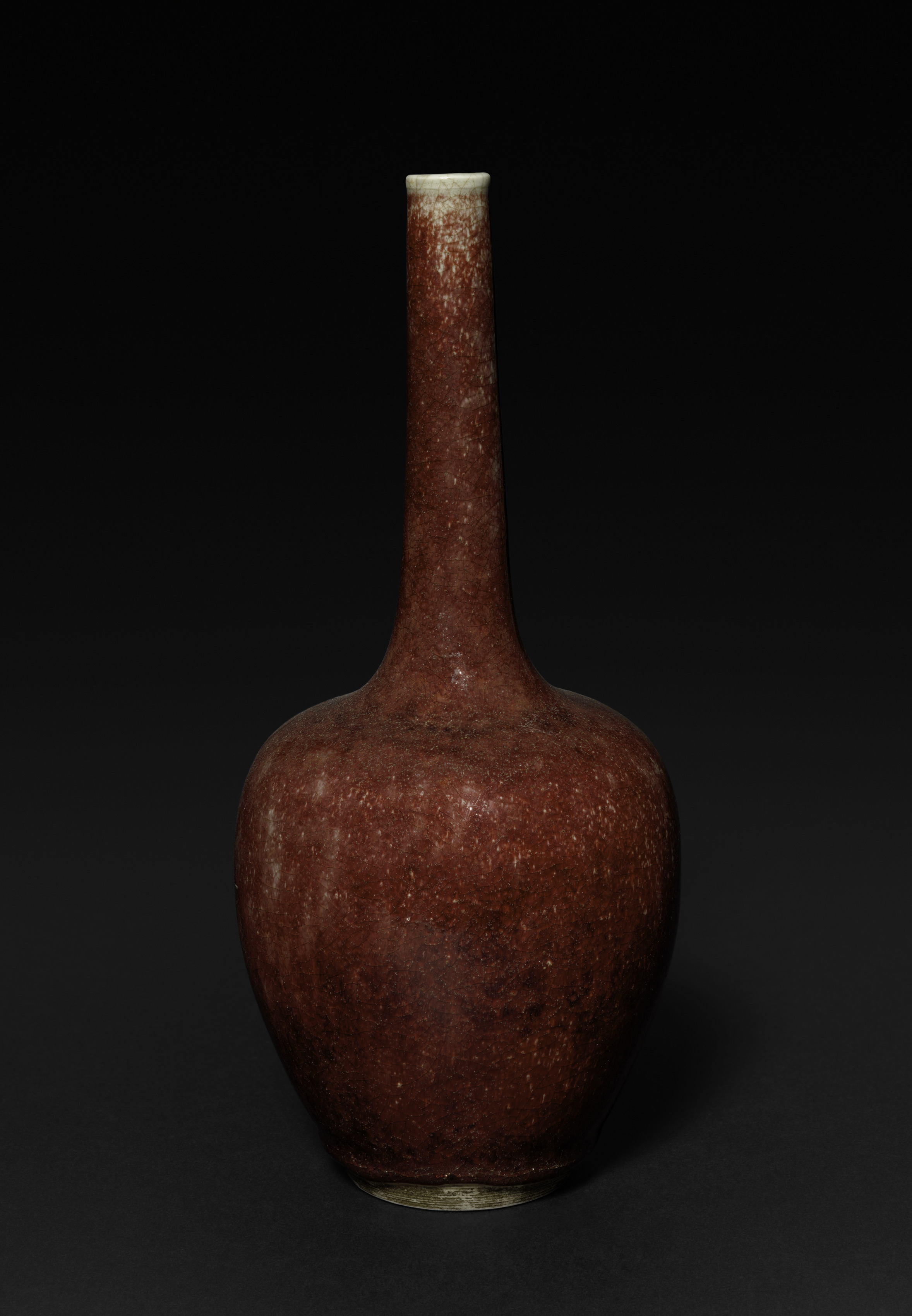 The Bottle Vase by artist is a brown ceramic vase. The vase has a bulbous body with a narrow neck and a small mouth. The body is rounded and symmetrical. The vase has a dark brown color with lighter brown and white speckles throughout. The neck and mouth are lighter in color, with a white rim around the mouth. The base of the vase is flat and has a small lip. The background is solid black.