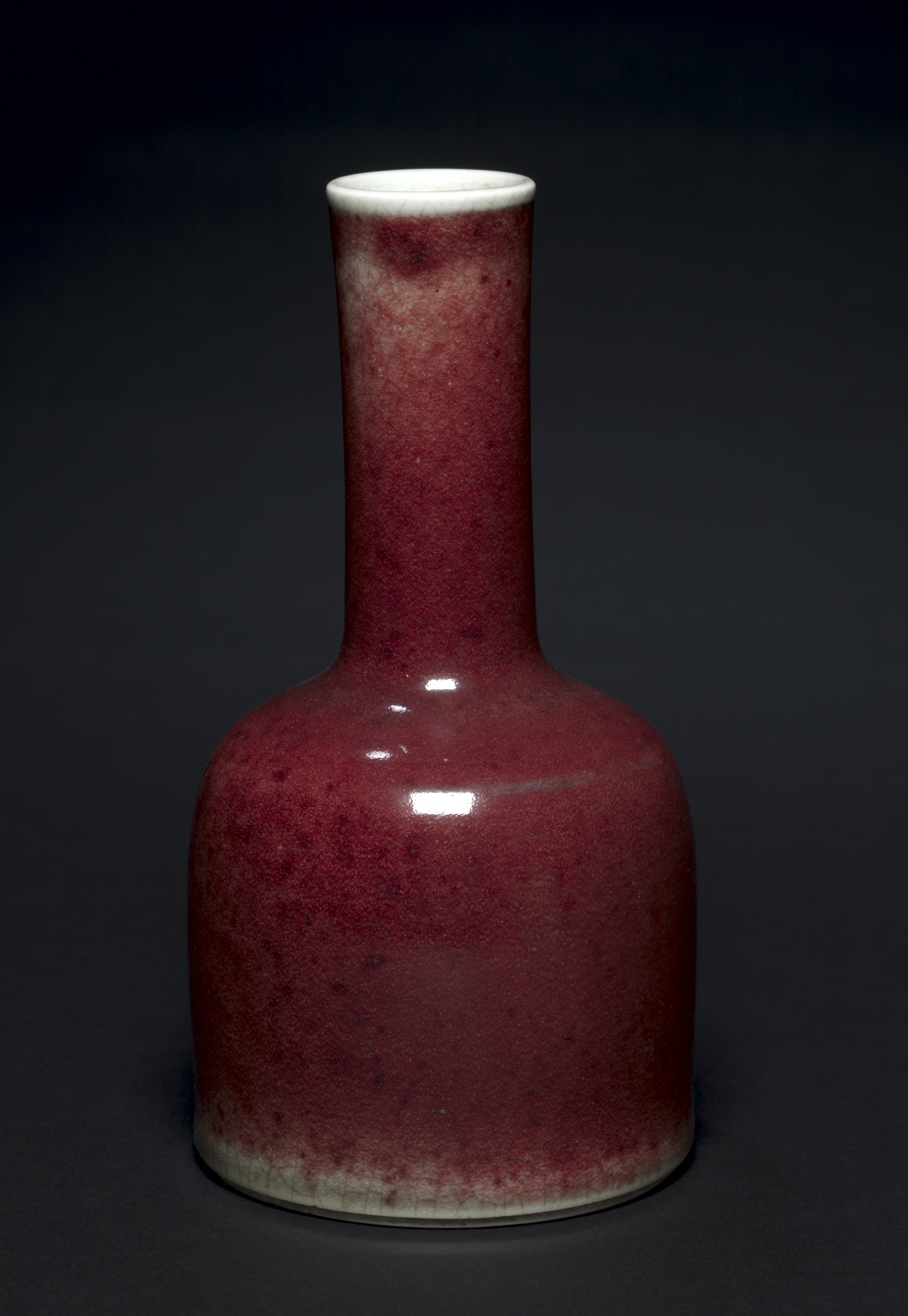 Bell-shaped Bottle: Lang Ware. The vase is bell-shaped with a narrow neck and a wide body. The vase has a glossy, dark red-brown glaze with a white rim at the top and a lighter-colored base. The base of the vase is also white. The background is dark gray. The glaze has lighter areas and some darker speckles. The overall shape is symmetrical.