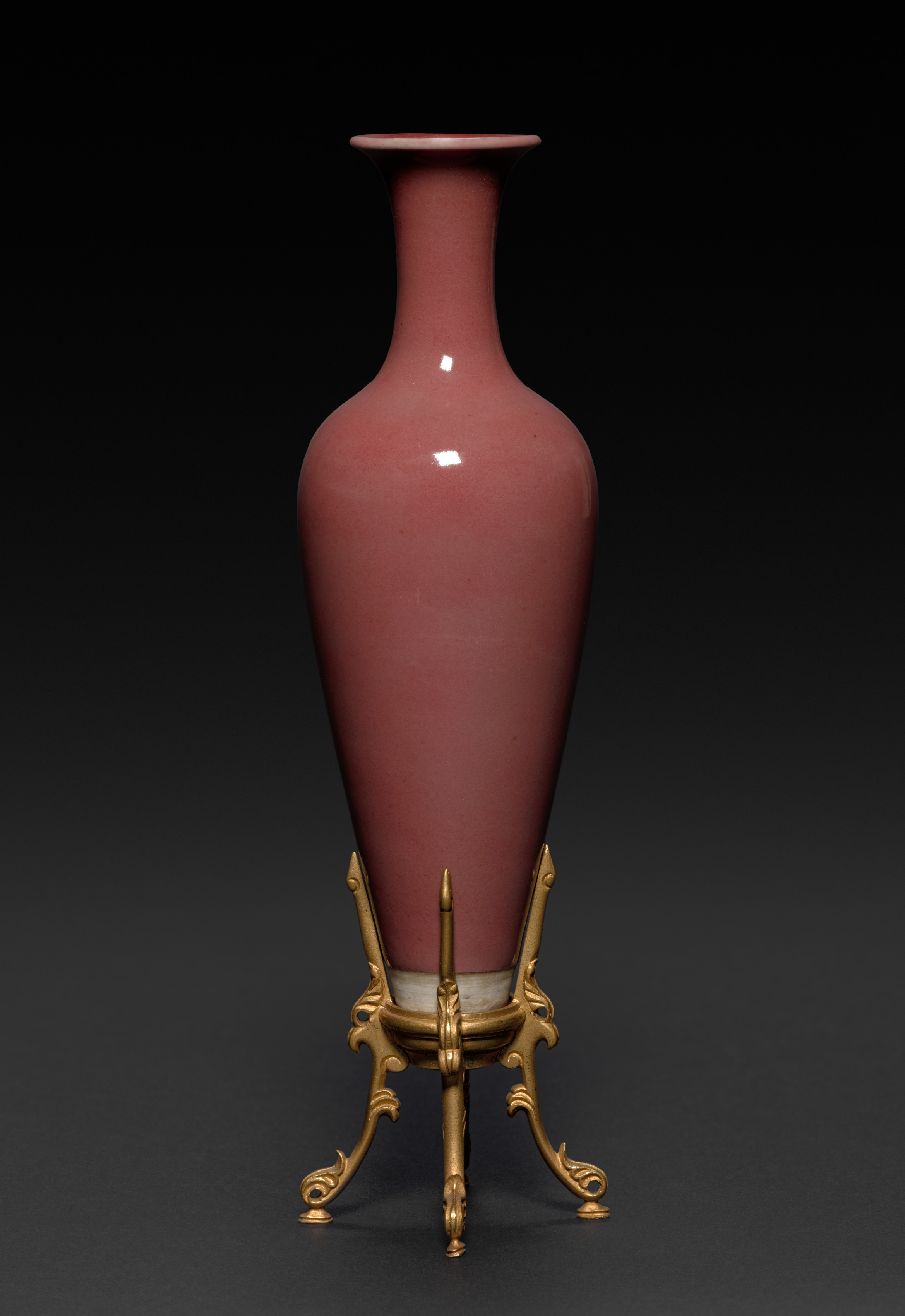 The image shows a bottle with a peach bloom glaze. The vase has a wide mouth and a narrow neck. The body of the vase is long and tapering. The vase is a reddish-pink color. The vase has a shiny glaze. The vase sits on a gold stand with three legs. The stand has decorative elements on the legs. The background is black, fading to dark gray at the bottom. The overall appearance suggests it is an antique piece. The artist of the vase is not visually identifiable in the image.