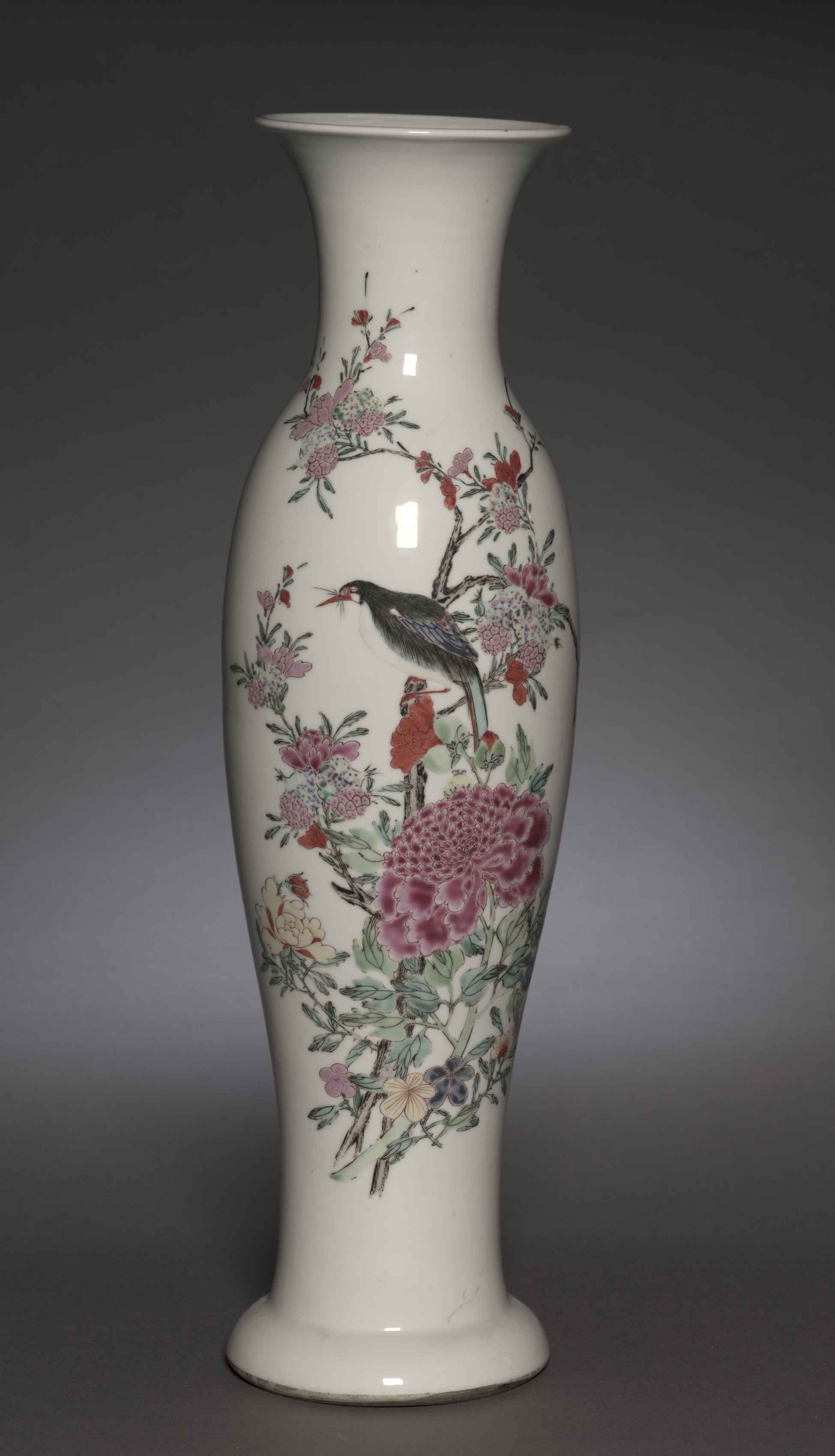 The image depicts a white vase by artist "Vase". The vase is tall and slender with a flared opening at the top and a narrow base. The vase features a colorful floral design with a bird perched on a branch. The floral design includes pink, red, and white flowers, as well as green leaves. The bird is black with a long tail. The background of the image is a gradient from dark gray to light gray. The vase appears to be made of ceramic or porcelain. The overall design on the vase is intricate and detailed.