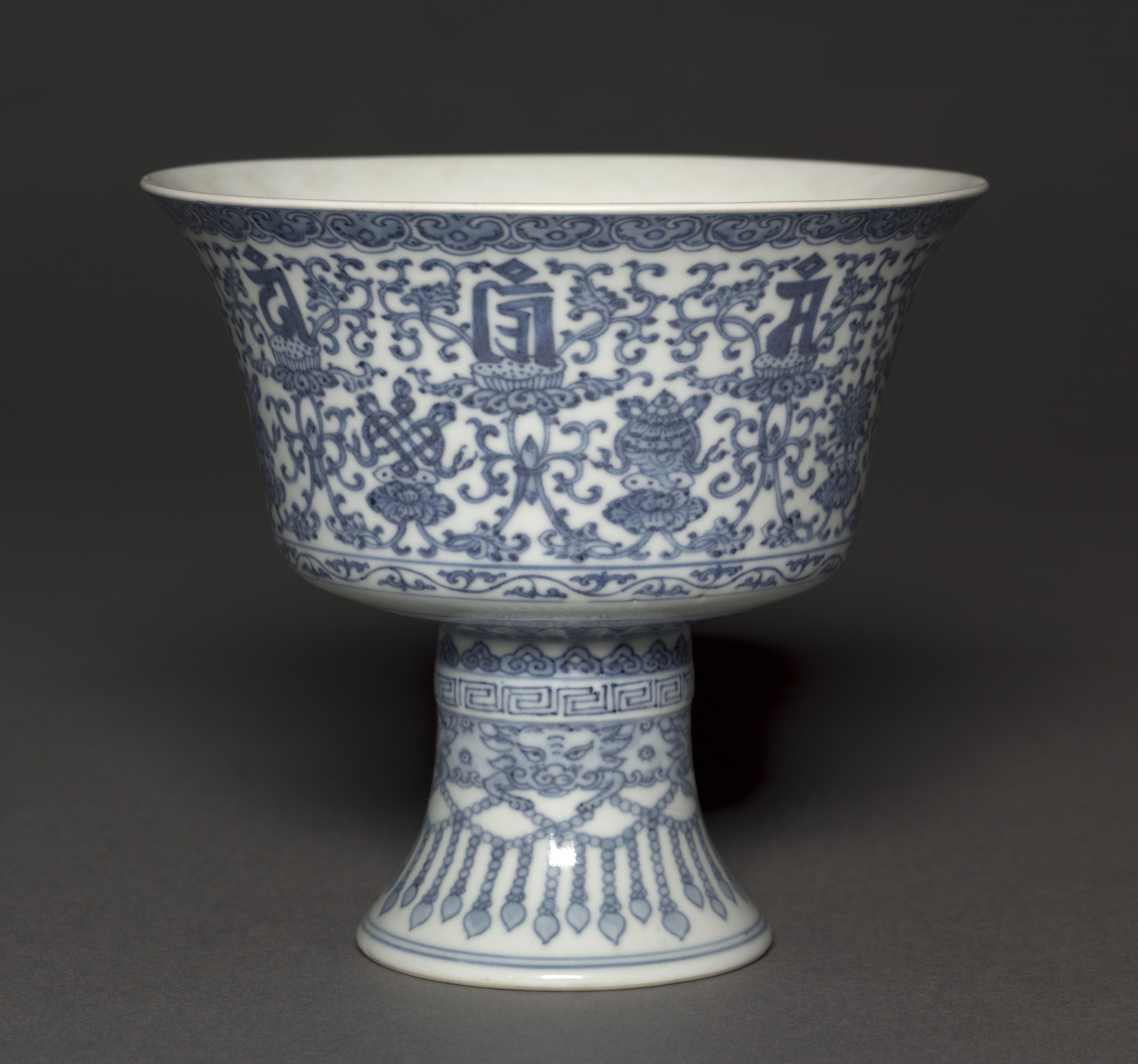 White porcelain stem cup with blue decorations. The cup has a wide mouth and a narrow base with a stem in the middle. The body of the cup is decorated with blue and white designs, including Tibetan characters and Buddhist symbols. The stem has a Greek key pattern around the top and a row of teardrop shapes hanging down. The background of the image is dark gray. The cup is centered in the image.