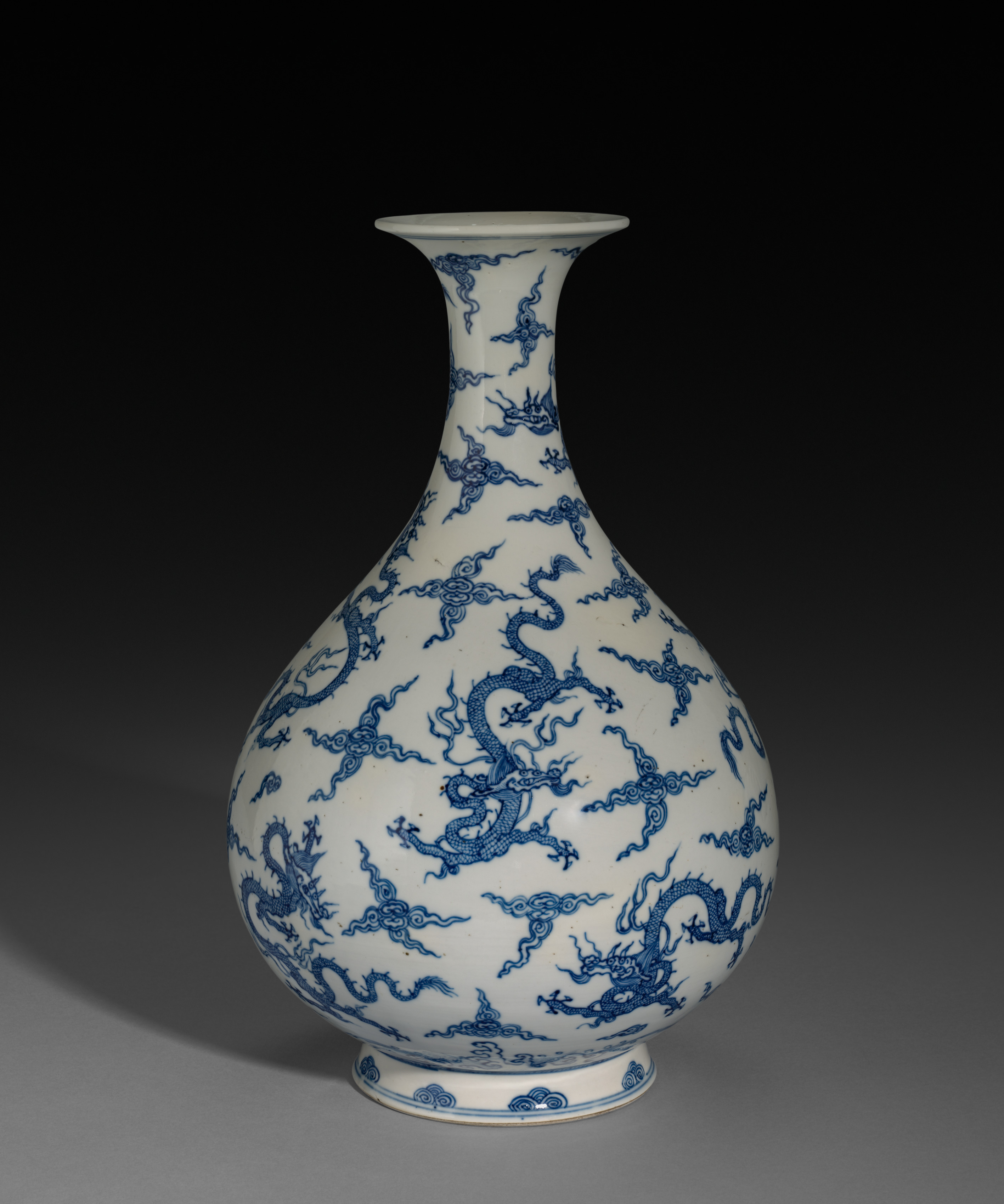 White vase with a narrow opening at the top and a bulbous body. The vase has a short neck and a small foot. It is decorated with blue dragons. The dragons have long bodies and tails, and some have five claws. The dragons are surrounded by clouds. The background is dark gray to black, with a shadow cast by the vase on the left side. The artist and title of the piece is "Bottle Vase".