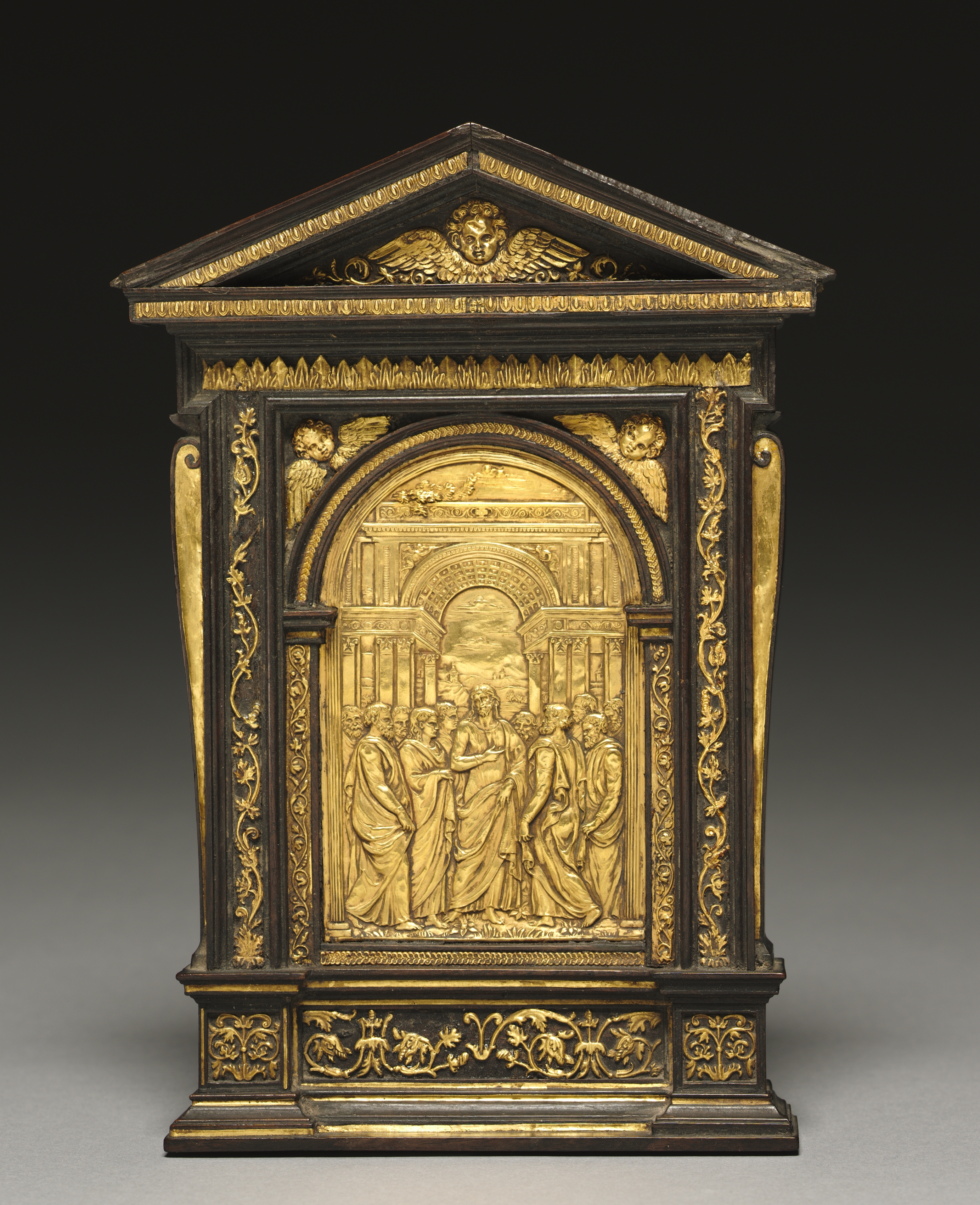 Dark brown and gold-colored object with a triangular top. A gold-colored relief panel depicts several figures in robes standing within and outside an arched structure. The panel framed by a border with ornate gold-colored designs. The frame of the object has ornate gold-colored decorations on a dark brown background. A lion's head with wings tops the triangular section. Two winged creatures are positioned on either side of the arched panel. The object sits on a gray surface with a black to gray gradient background.