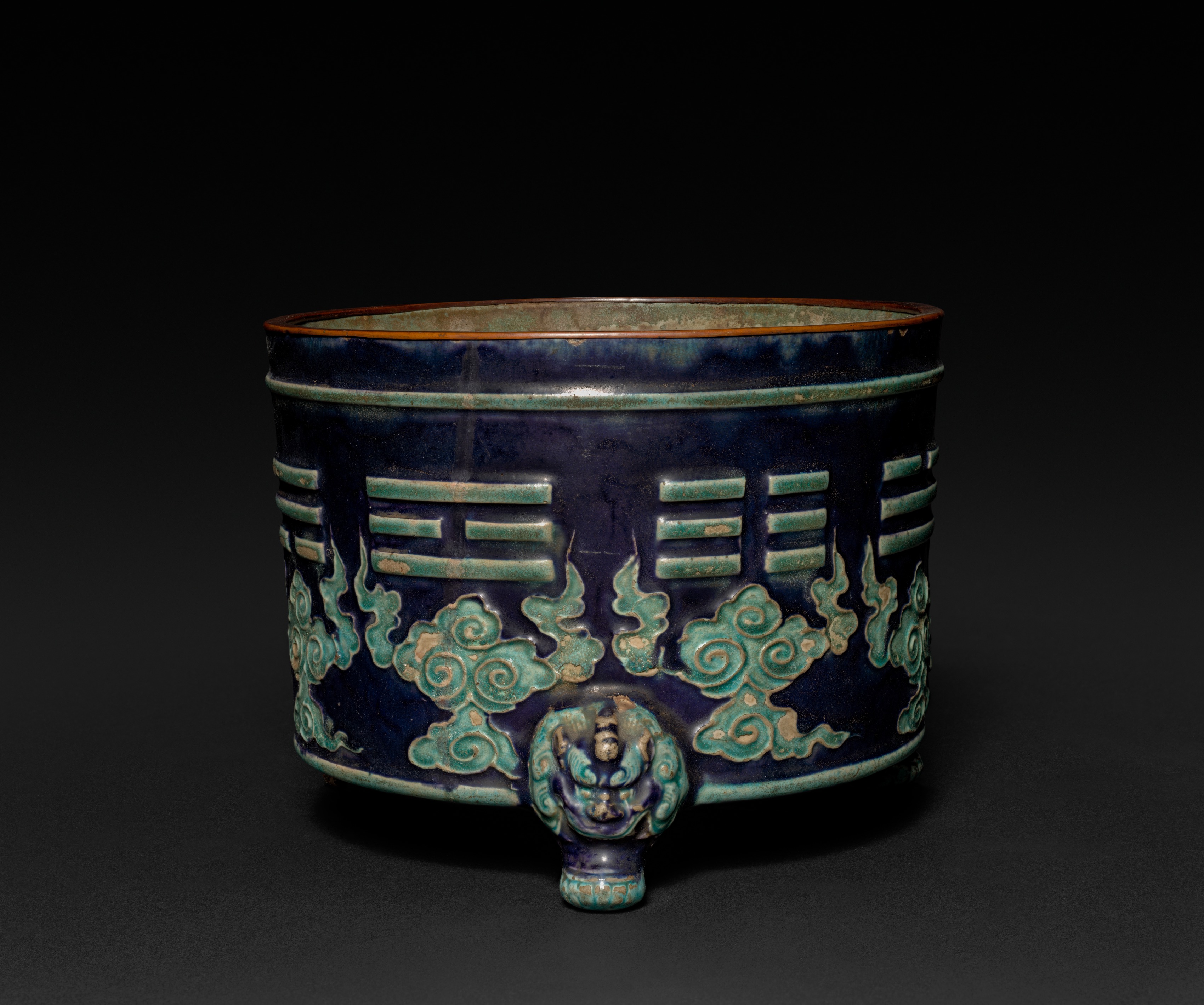 Small Jardiniere with Three Legs: Fahua Ware. The ceramic jardiniere has a wide cylindrical body with a flat bottom and three short legs. The exterior is predominantly dark blue with green accents. Horizontal green lines are at the top and bottom. A band of green rectangular lines is in the middle. A design of green and gold stylized clouds and flames is below the rectangular lines. A small green and blue mask is on the front, between the legs. The inside is a mottled green and brown. The rim has a thin brown line. The background is black. The object is set against a dark gray surface.