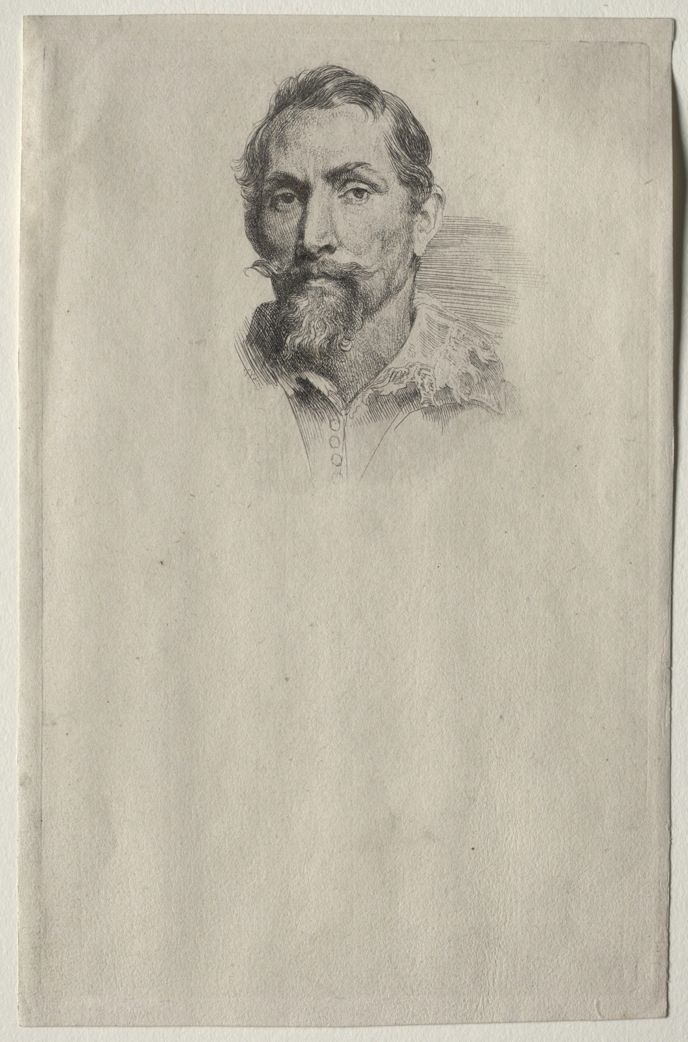 Portrait of Frans Snyders, a middle-aged man with short hair and a beard, looking to the right. He wears a high-collared shirt with lace trim. The drawing is in shades of gray on a rectangular piece of paper with rough edges. The background behind the subject is darker at the top and lighter at the bottom. The paper has a worn, aged appearance.