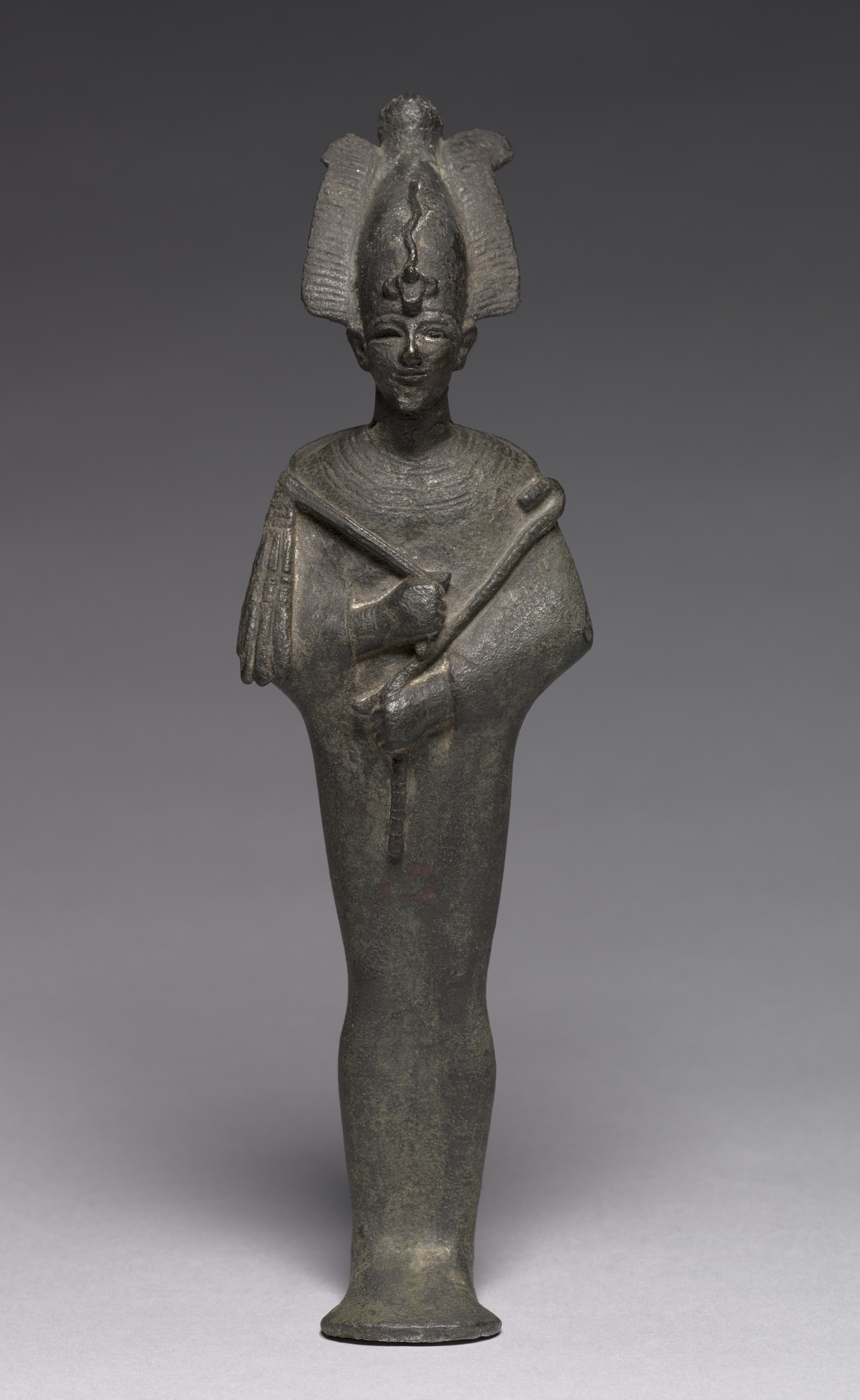 The Statuette of Osiris by an unknown artist depicts a bronze or metal figure of a man with a tall, ornate headdress. The figure is standing upright on a small base, with a long body that tapers towards the bottom. The headdress features a central element with a rounded top and two side elements that resemble wings or fans, and has horizontal lines etched into it. The face is rendered with a closed mouth and eyes that appear to be looking directly forward. The figure wears a short, collared garment and holds a long staff or scepter in both hands, crossed over the body. The background of the image is a gradient that transitions from dark gray at the top to light gray at the bottom. The object appears to have a greenish tint.