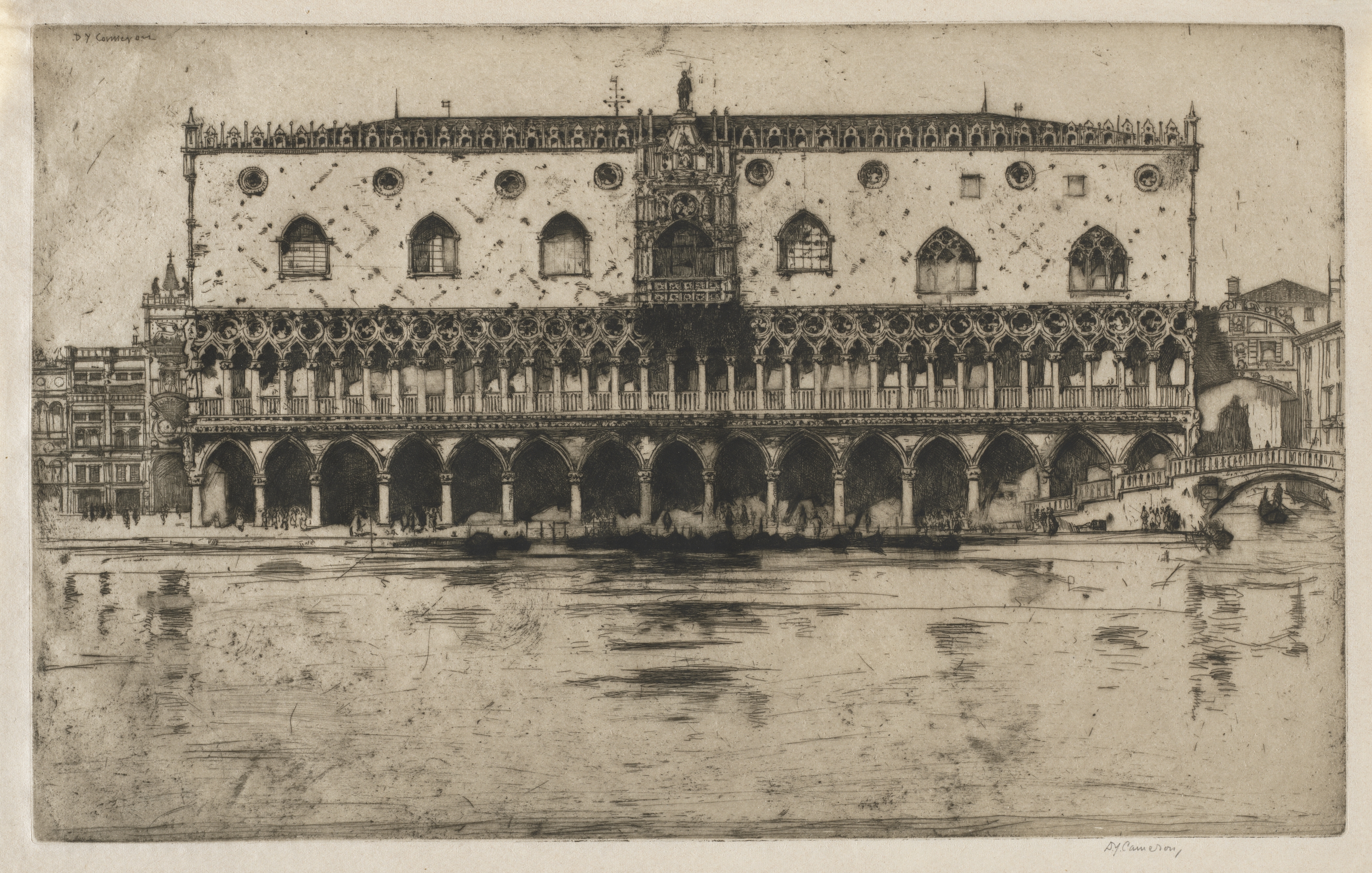 Large building with two stories and a row of arches on the bottom story. The building has a flat roof with a decorative edge. There are several windows on the upper story, some are arched and some are rectangular. The building's facade is ornate, featuring intricate carvings and details. A bridge is to the right of the building. The building is reflected in the water in front of it. The water is calm, with only slight ripples. The image is in shades of brown and gray. The artist's signature is in the bottom-right corner and top-left corner. The title of the piece is "Doge's Palace" by David Young Cameron.