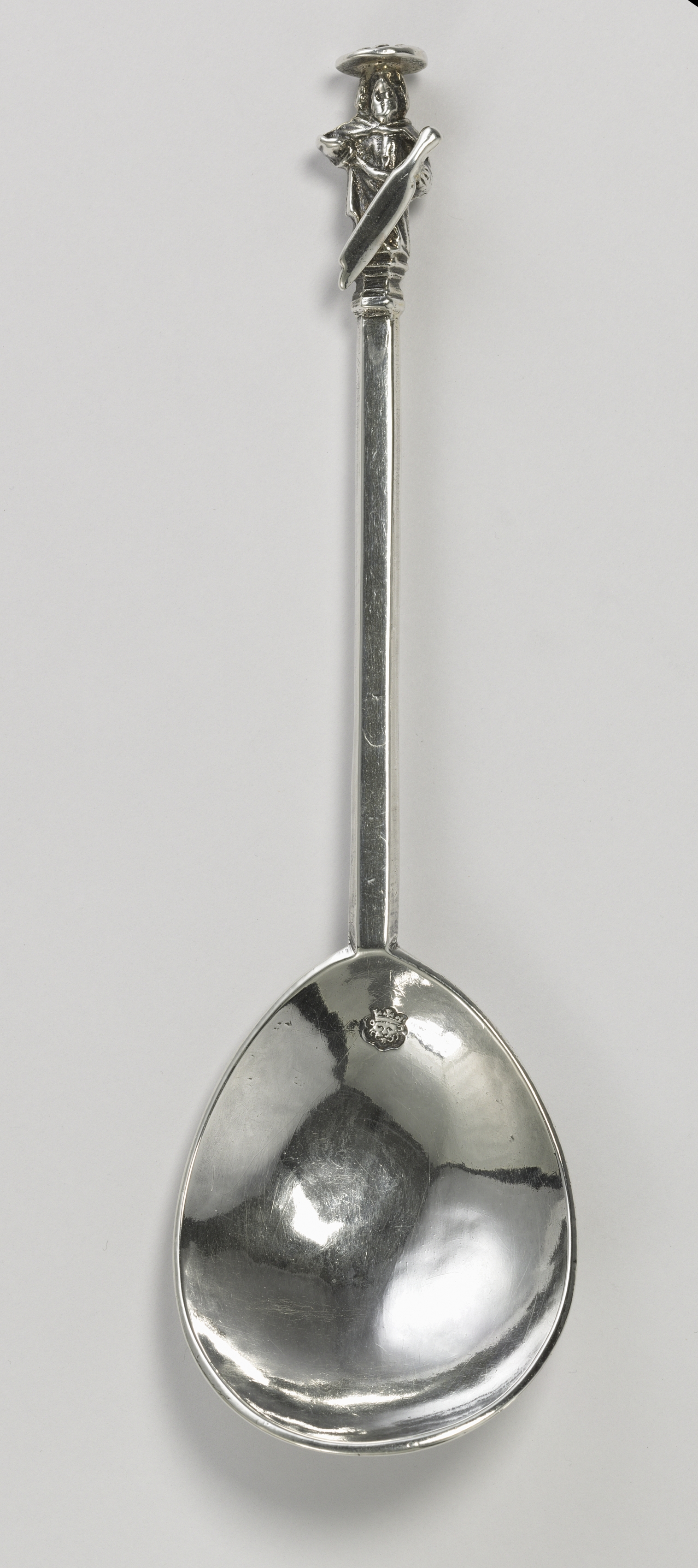 Saint Bartholomew Spoon by artist unknown. The spoon has a long handle with a figure on top. The figure is a man with a long beard and hair, wearing a loincloth. He has his left arm bent up and across his body. A large knife is across his body, on his right side. His right arm is down. The spoon bowl is large and oval shaped. The spoon is silver. The background is light grey.