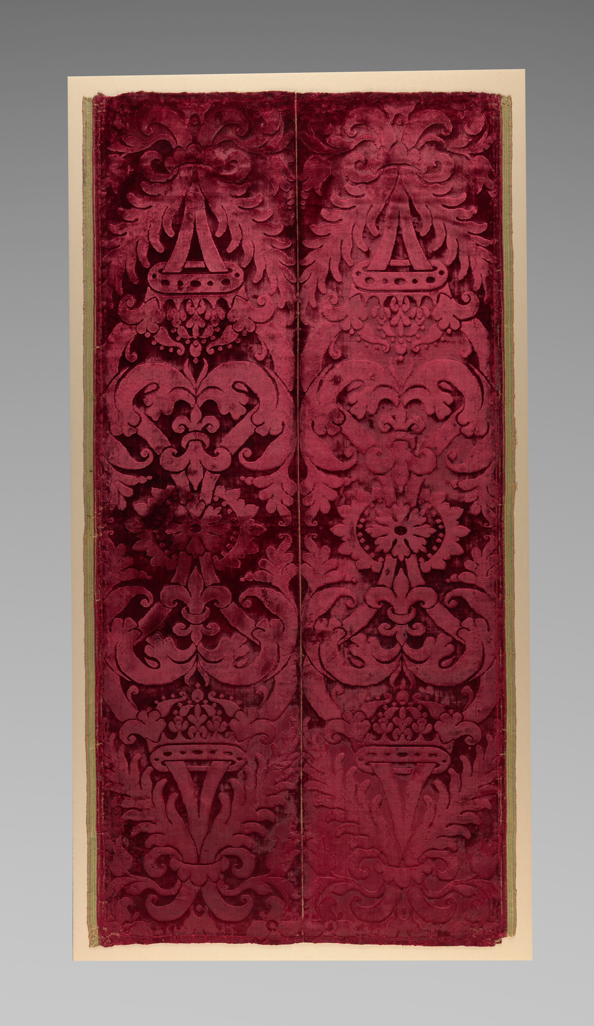 The image depicts a pair of richly decorated red velvet panels; the panels are long and rectangular. A decorative beige or off-white lining is on the edges of the panels; there appears to be another green lining underneath. The panels are adorned with an intricate raised design featuring a central floral motif and curved leaves and flowers. A crown-like element sits atop the design on both panels. Prominent features include large, symmetrical floral patterns and curved lines throughout. The panels have a soft, luxurious appearance, characteristic of velvet. The background is a gradient gray. The title of the image is "Procurator's Velvet Stole".