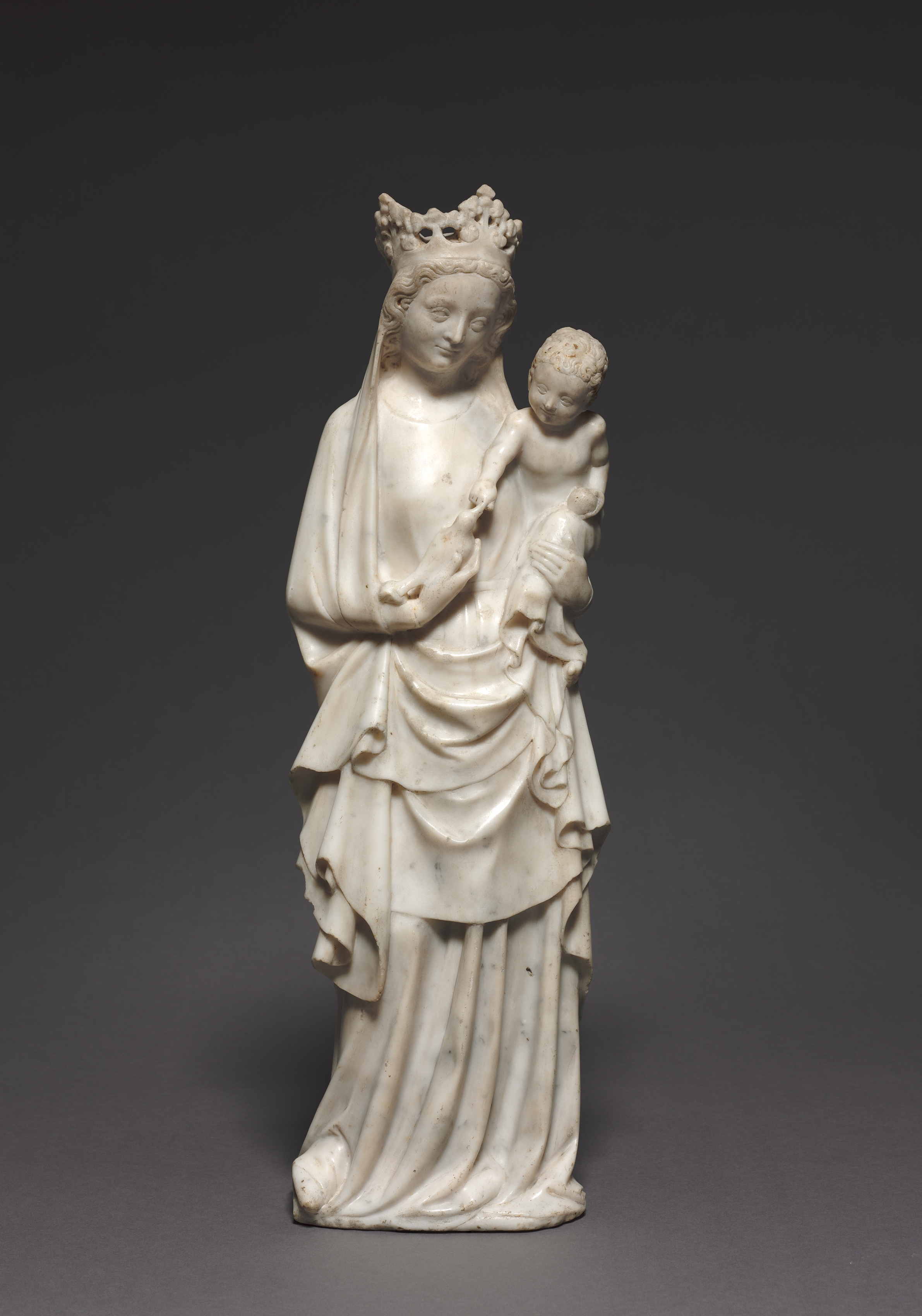 The sculpture "Virgin and Child with a Bird" by an unknown artist depicts a woman wearing a crown and a long robe with a veil covering her hair, standing and holding a naked baby in her left arm and an object in her right hand. The woman's robe has folds that drape down to her feet. The baby has short hair and appears to be looking down. The sculpture appears to be made of white stone or marble. The woman wears a crown on her head. The background of the image is dark grey.
