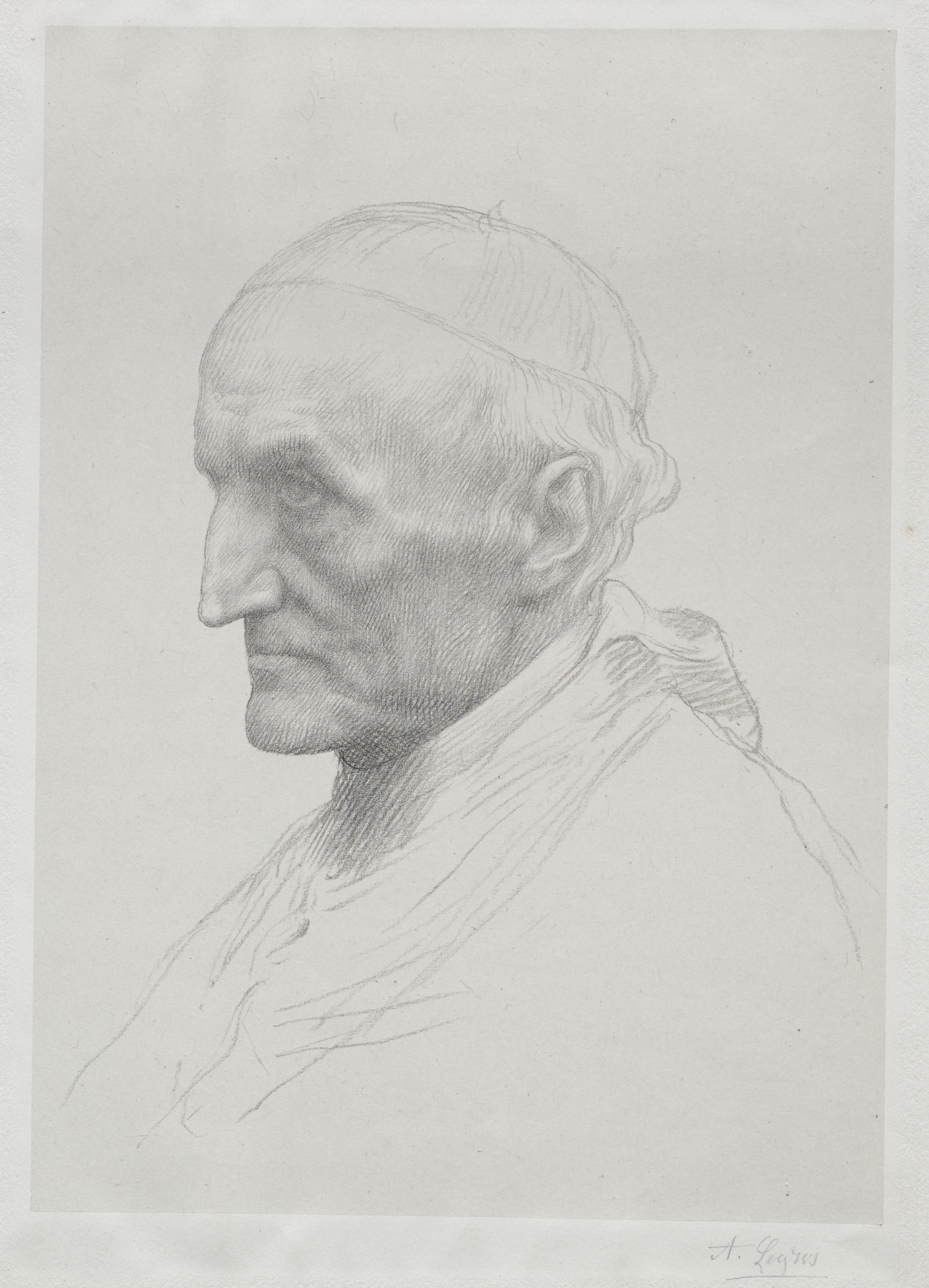 A black and white pencil drawing on paper of a man's head and shoulders. The man is elderly and wears a skull cap covering his balding head. He faces left and wears a clerical collar. The background is plain. The artist's signature is in the bottom right corner.