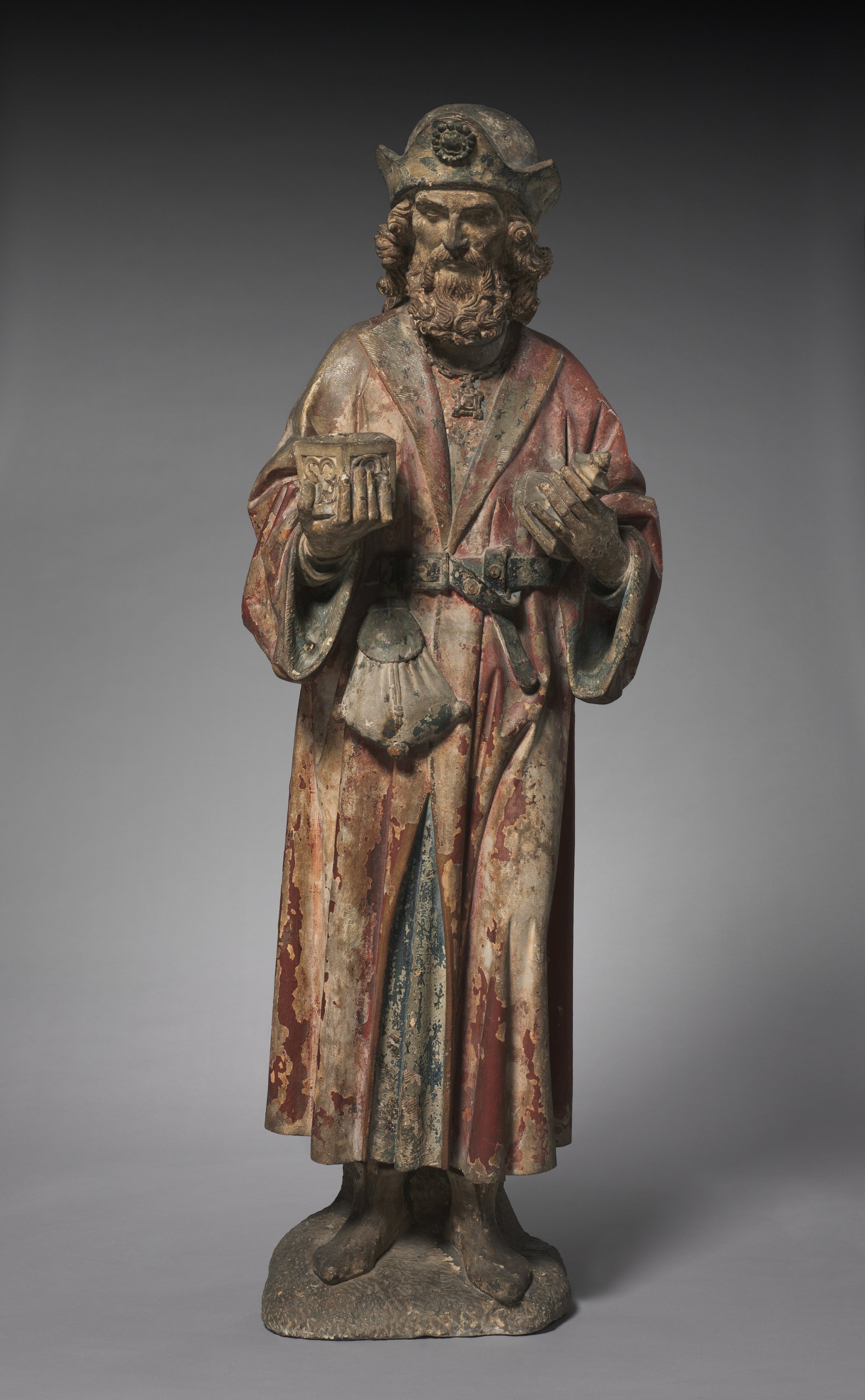 The Magus from an Adoration Group depicts a man with a beard and long hair wearing a hat with a circular emblem on the front and a long robe with remnants of red paint visible. He wears a belt with a pouch attached on the left side. He holds an object in his right hand and an object resembling a vessel or chalice in his left hand. His facial expression appears neutral. The figure has a weathered appearance with a base that is flat and oval-shaped. The man is barefoot. The background of the image fades from dark at the top to light gray at the bottom.