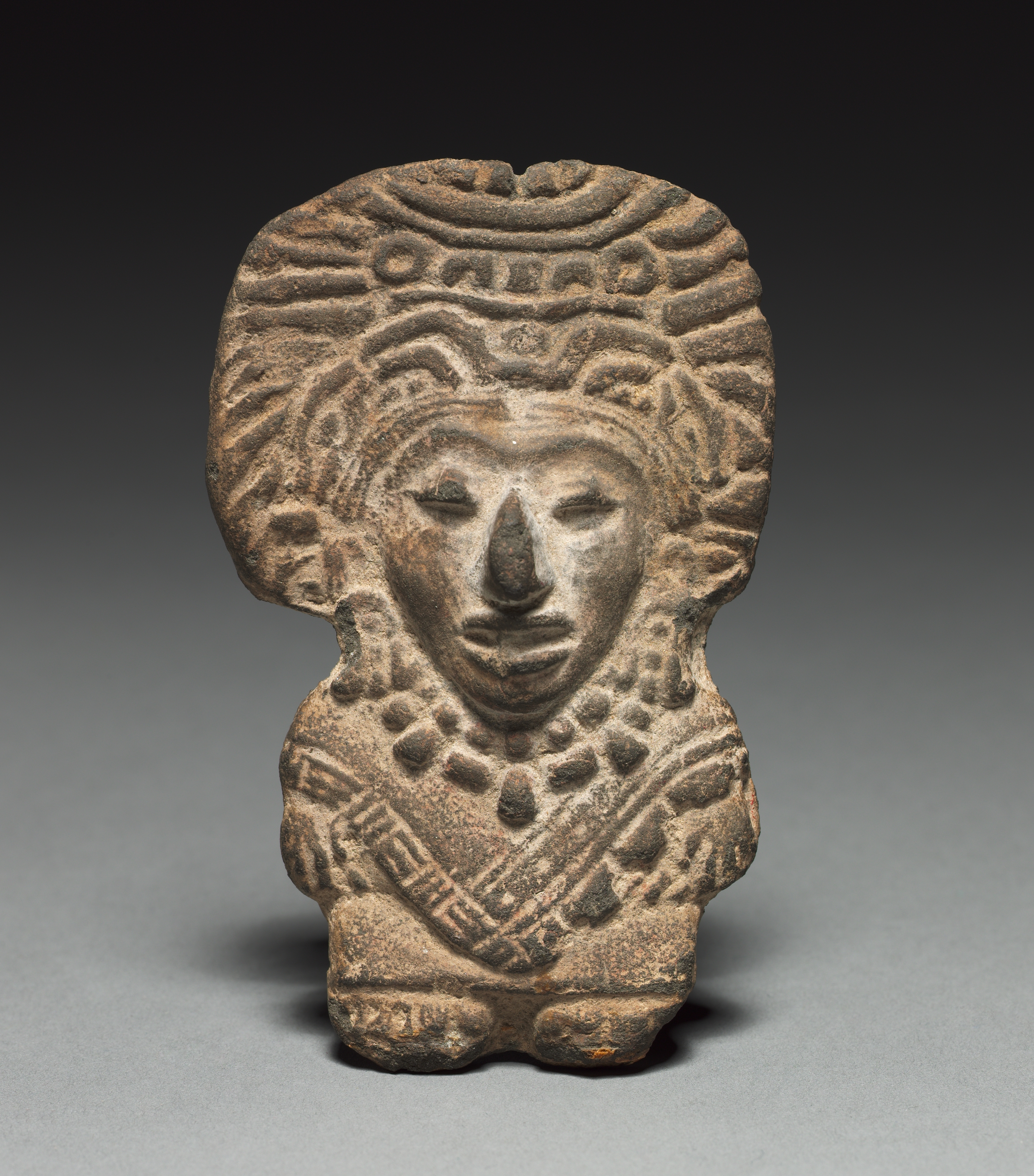 Brown stone statue of a figure with a large head. The figure has a large head with a flat top and a rounded face. The face has a nose and mouth but no visible eyes. The figure has a beaded necklace and a decorative collar. The figure has a large, rounded headdress. The background is gray. The title of the work is "Idol" by an unknown artist.
