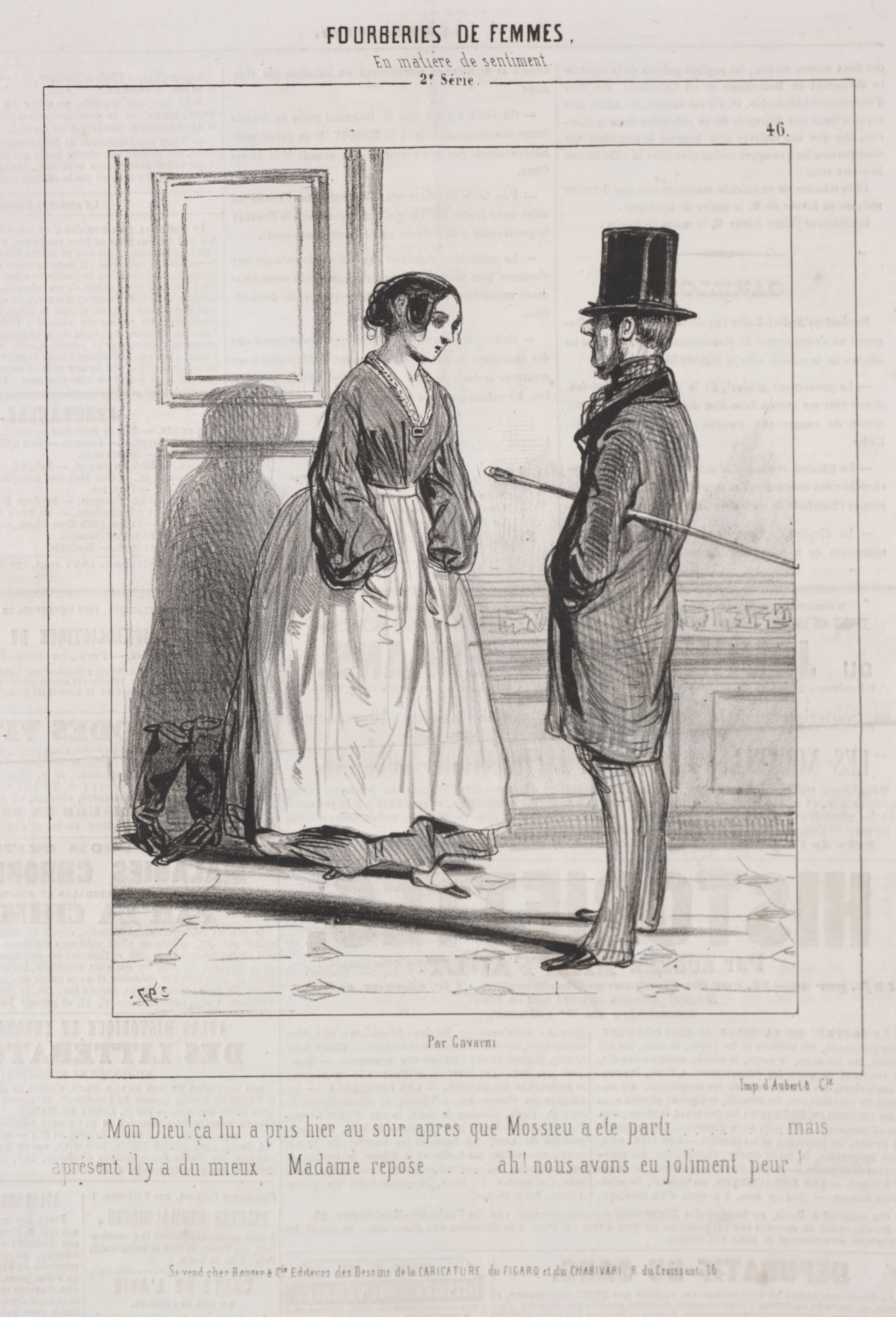 Black and white illustration of a man and woman standing facing each other. The woman wears a long dress with puffy sleeves and an apron. Her hair is pulled back. The man wears a top hat, striped pants, and a long coat. He holds a cane. Text is written in French above and below the illustration. The title at the top reads "FOURBERIES DE FEMMES" and is followed by a subtitle. A number "46" is in the upper right corner.