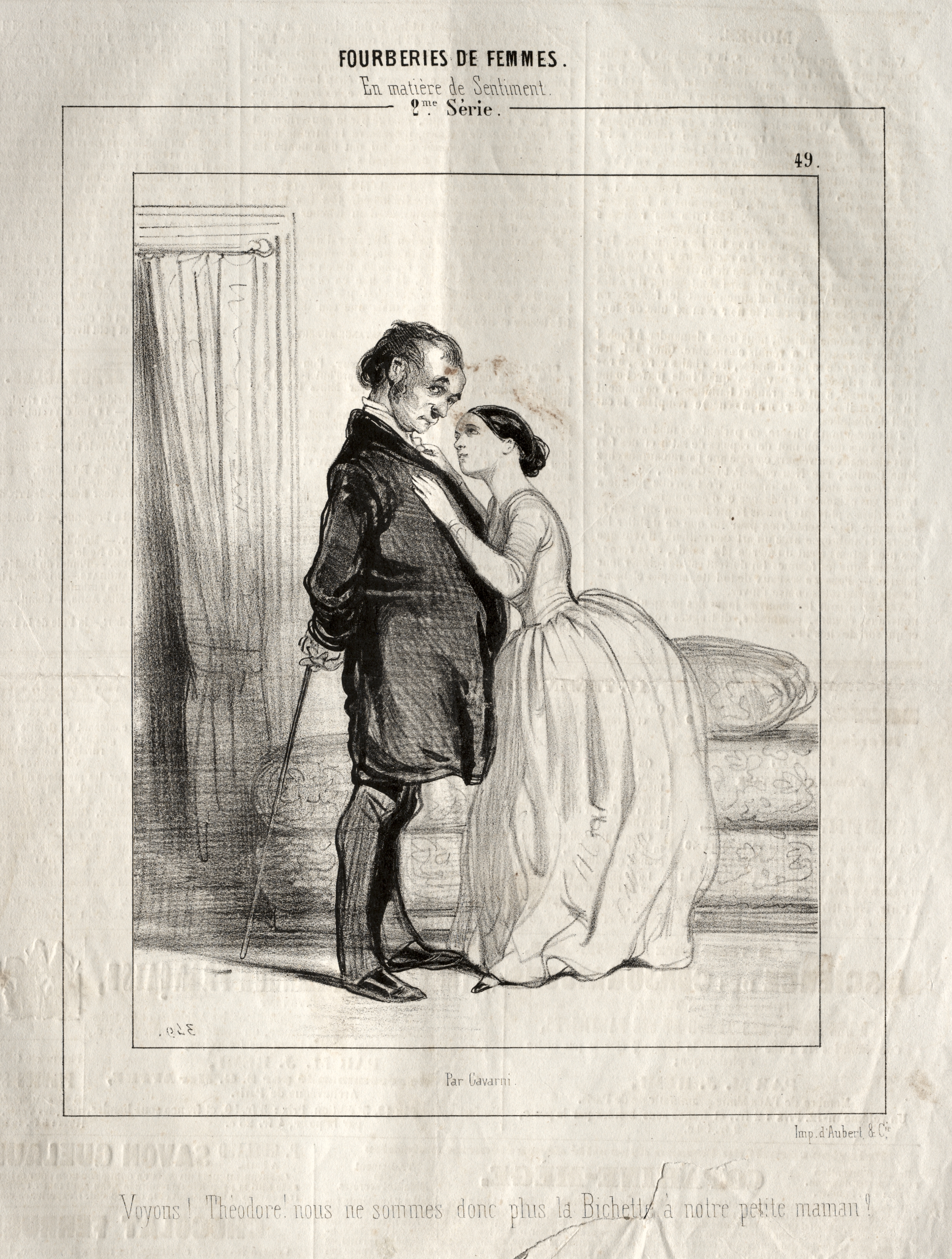 Black and white drawing of a man and woman indoors. The man is on the left and wears a dark suit and holds a cane. The woman stands on the right and wears a light-colored dress. Their faces are close to each other. A window with a curtain is behind them on the left. A bed with a pillow is behind them on the right. Text is at the top and bottom of the image. The number 49 is in the upper right corner.