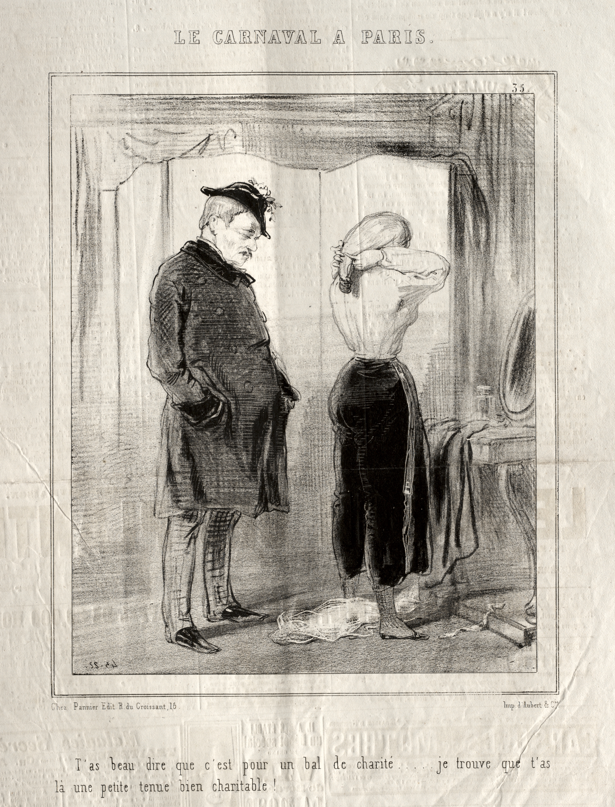 Black and white drawing of a man and woman. The man on the left is wearing a dark-colored long coat, pants, dark shoes, light socks. He has his hands in his pockets and is wearing a dark hat. The woman on the right is standing with her back to the viewer facing a mirror on a dresser to her right. She is wearing a white loose blouse and dark pants. Her hair bun is held up by her left hand. The background shows a curtained alcove or room. The drawing is titled "Carnaval A Paris" at top center. French text appears at the bottom.
