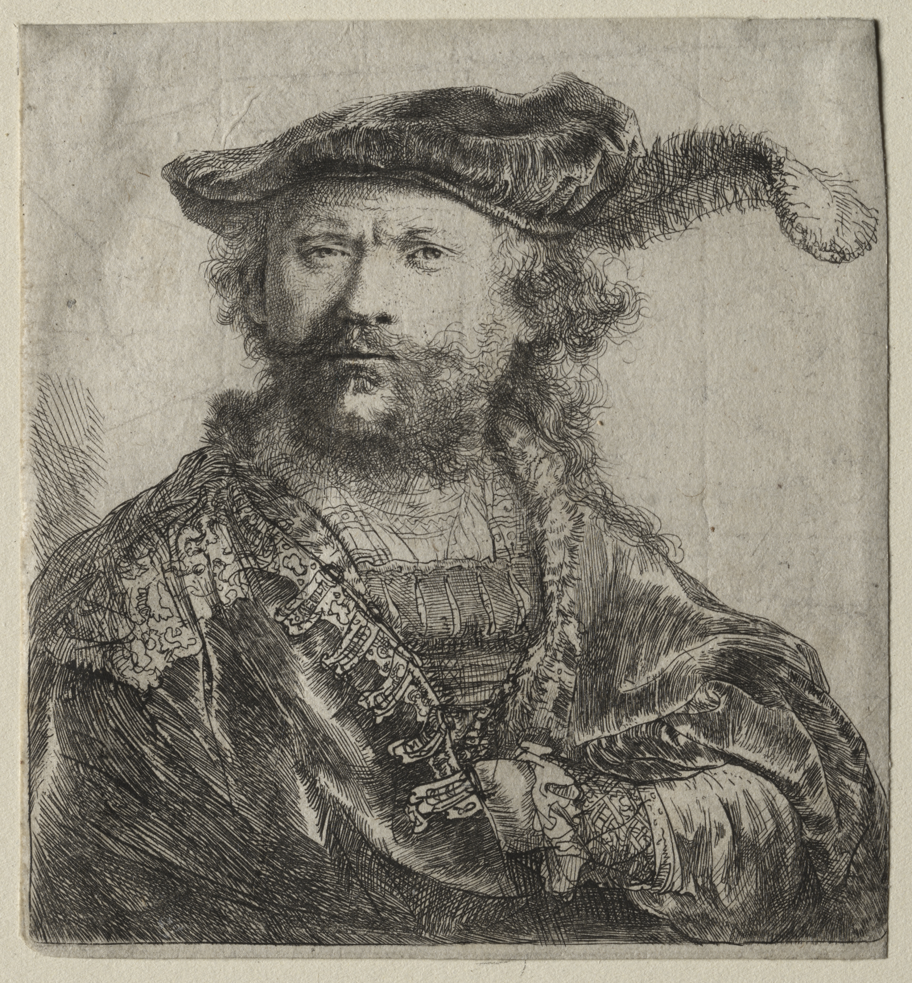 The image depicts a man with curly hair, a beard, and a mustache. He wears a velvet cap with a plume on the right side. The man has on a decorative top with lace-like patterns on the chest and sleeves. A cloak or shawl with ornate details is draped over his shoulders. The drawing is in black and white, with detailed lines and shading, and the background is a light gray color. The man is shown from the chest up, facing slightly to the left.