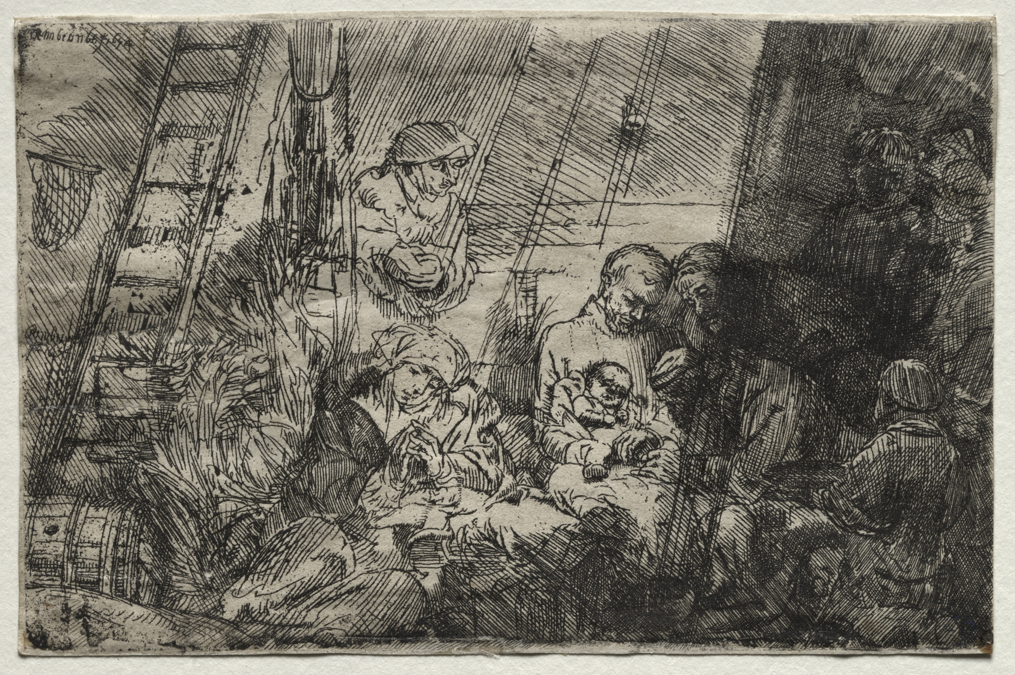 Black and white image of a drawing. A group of people sitting and standing around a baby on a man's lap. The baby is positioned on the lap of the man on the right. The woman sitting to the left of the man holds her hands folded together. A man stands behind them on the right and another on the left. A woman on the far right has her back turned. A basket and a ladder are on the left. The background lines create a slant, suggesting a slanted roof. The entire image is drawn with lines.